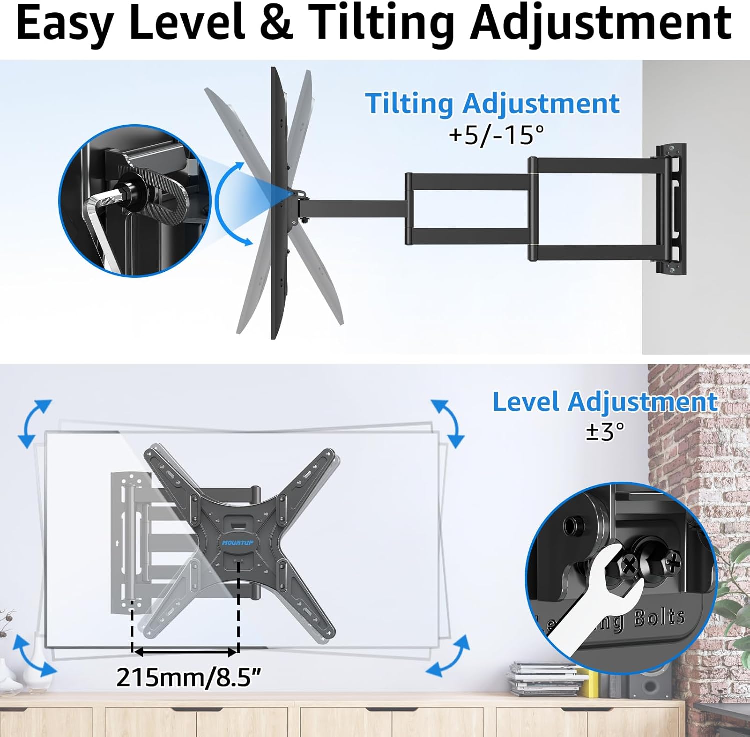 - Full Motion TV Mount: The TV wall mount features a swivel angle of +/-90°, a tilting angle of +5/-15°, level adjustment of +/-3° after installation. With easy level and tilting adjustment, you can customize the TV angle to your needs and enjoy watching TV