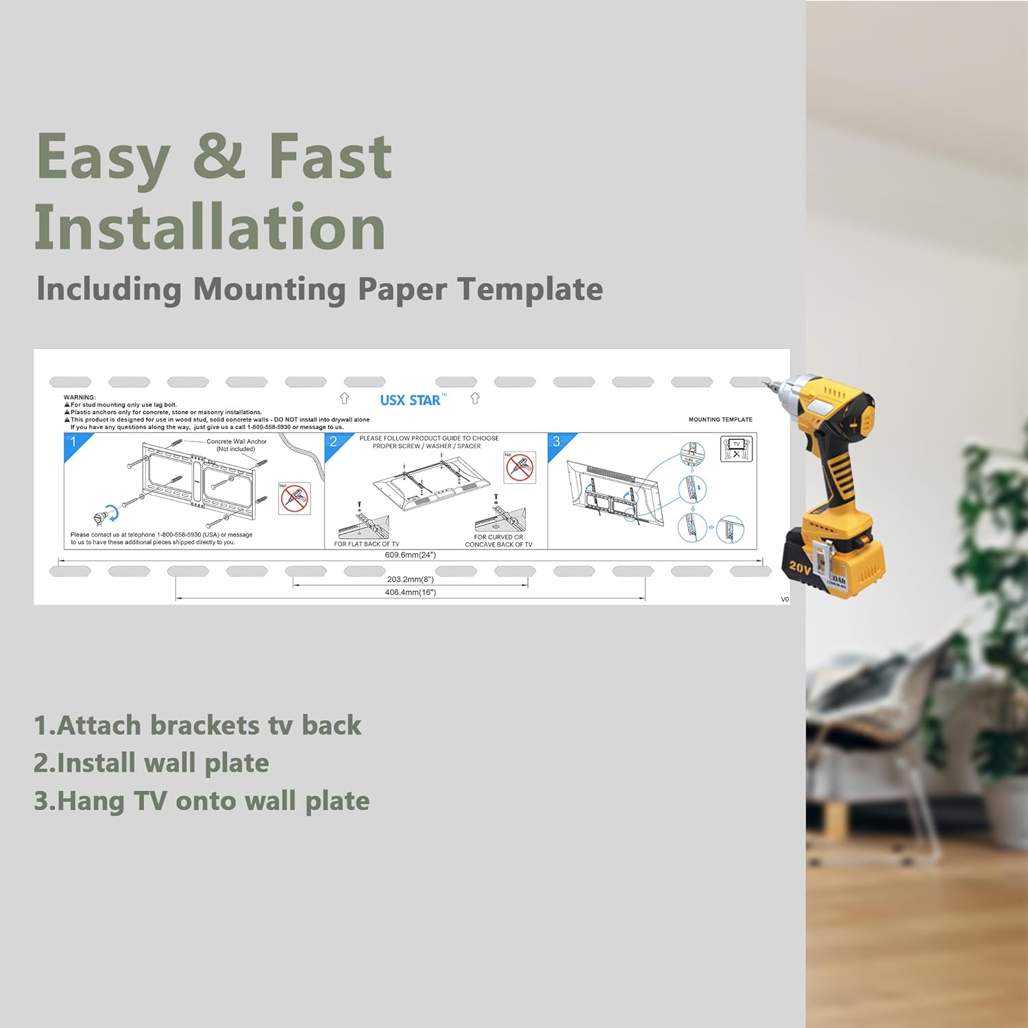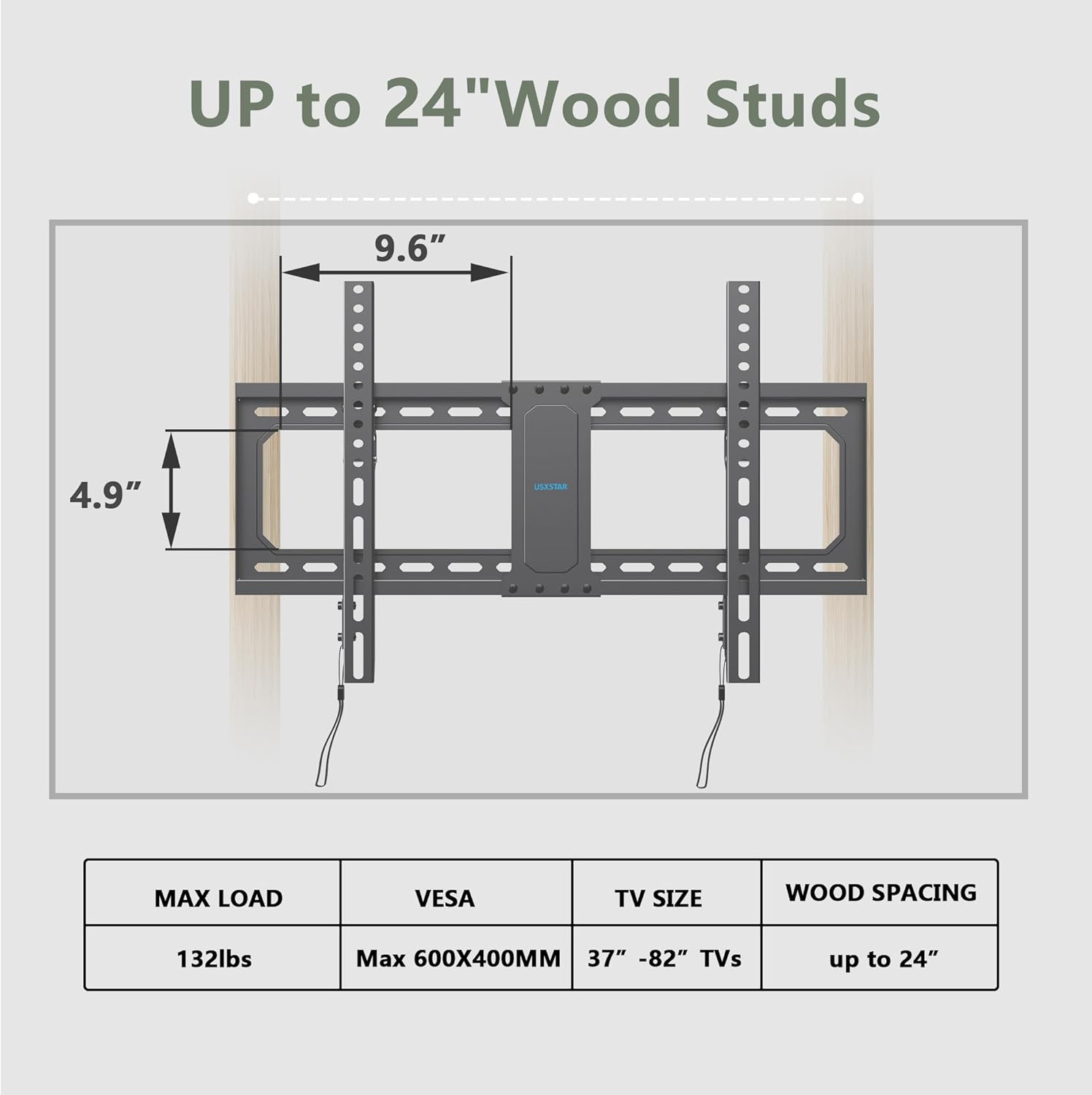 - Fits most 37-82 Inch TVs: Please verify TV VESA (the mounting hole patterns of tv back) within 150*100 mm to 600*400 mm and TV less than weight 132 lbs; Up to 24 inch wood stud spacing