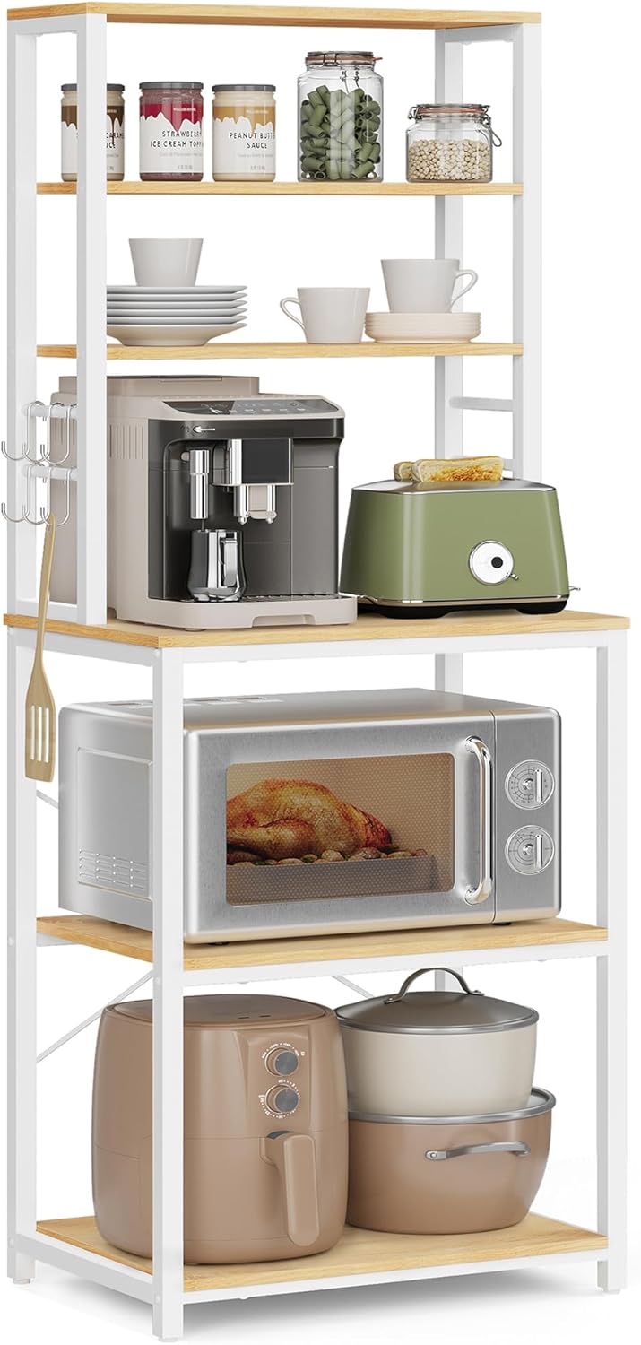 - [Storage for All] Free up your counter space with this baker’s rack that boasts tons of storage—3 upper shelves for bottles, 3 large lower shelves for kitchen appliances, and 6 S-hooks for cooking tools. This all-in-one rack streamlines your kitchen!