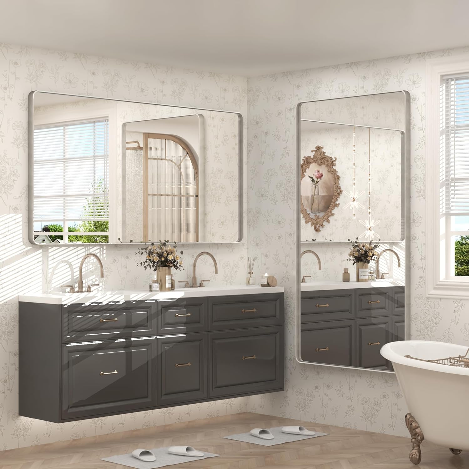 60x30 Silver Bathroom Mirror, Brushed Metal Framed Mirror for Vanity, Rounded Corner Rectangle Mirror for Wall, Anti- Rust, Shatterproof (Horizontal/Vertical)