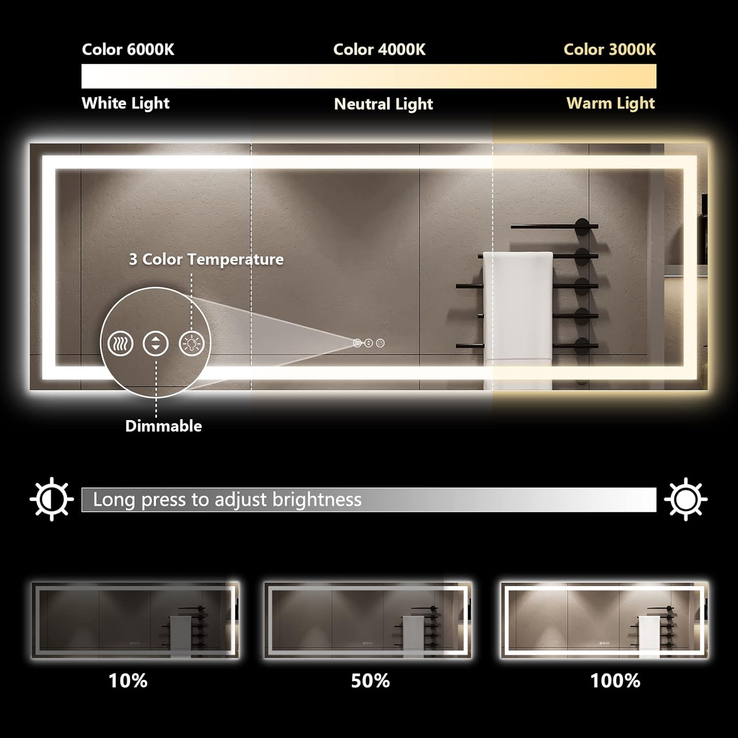 - ✨【Color Changeable & Brightness Adjustable & Memory】- Yeelait lighted mirrors for bathroom wall features multiple light settings that are easily controlled with sensitive touch buttons. Short press the button to change the light color: White (6000K) - Neutral (4000K) - Warm(3000K), long press the button to dim the brightness to your comfortable level (100%~10%). The Smart Memory Function will record the lighting setting and keep the previous lighting status after turning off and on.
