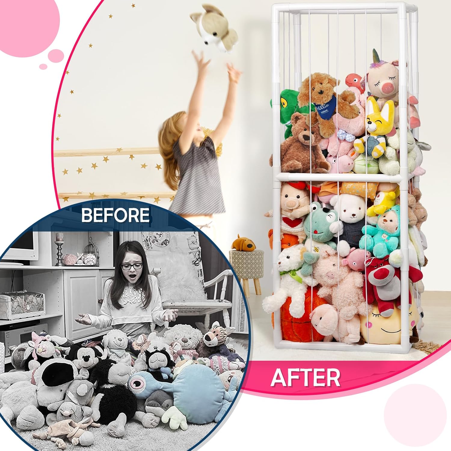 - ăSturdy ConstructionăIt is made with a sturdy, PVC and has a white base. The stuffed animal storage is designed with style and functionality in mind, perfect for playhouses, nursery room, kindergartens, corners, room organization.