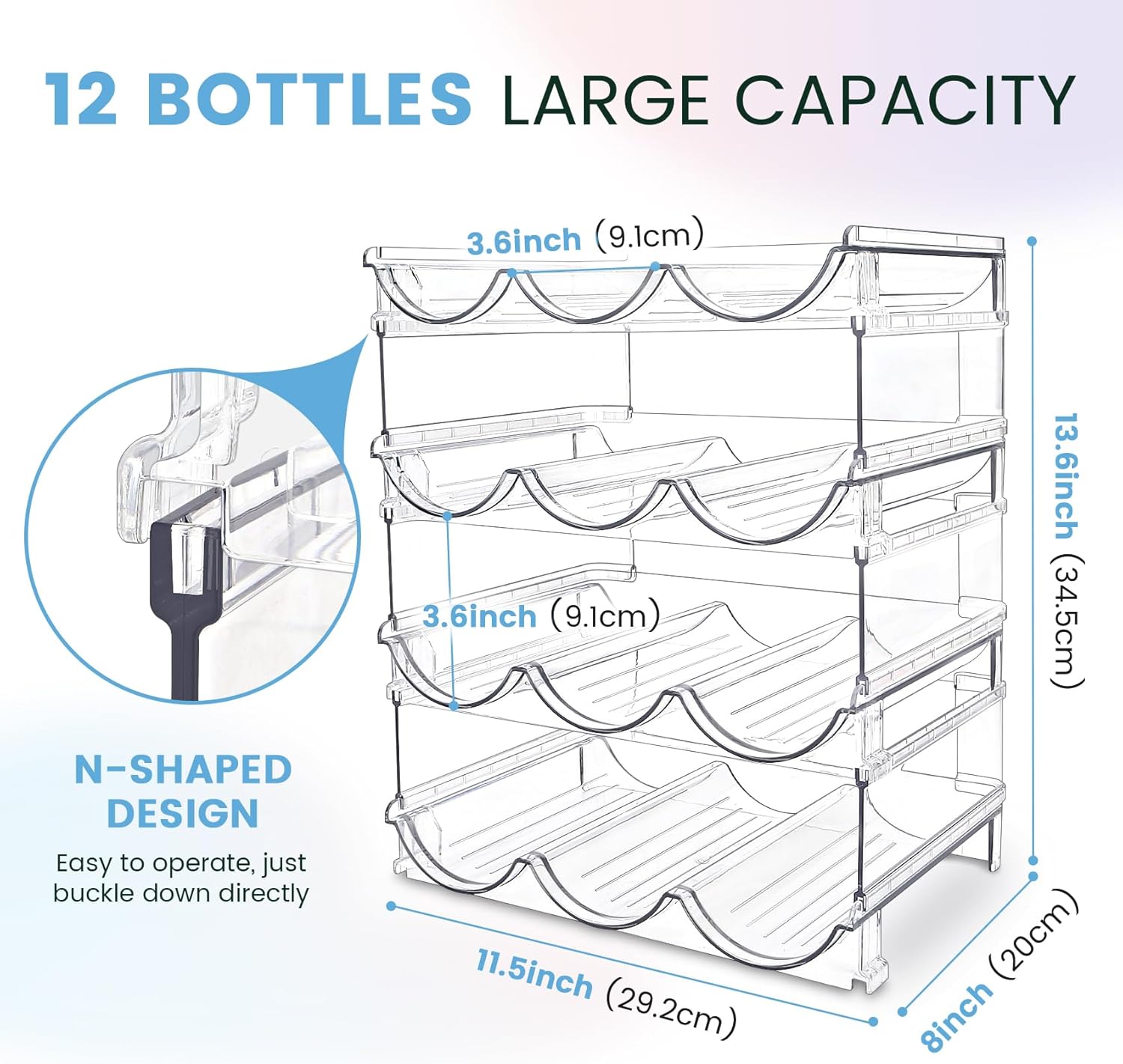- Space Saving: The stackable water bottle storage organizer fit most cabinet or refrigerators. Bottle rack dimensions: 11.5*8*13.6 inches