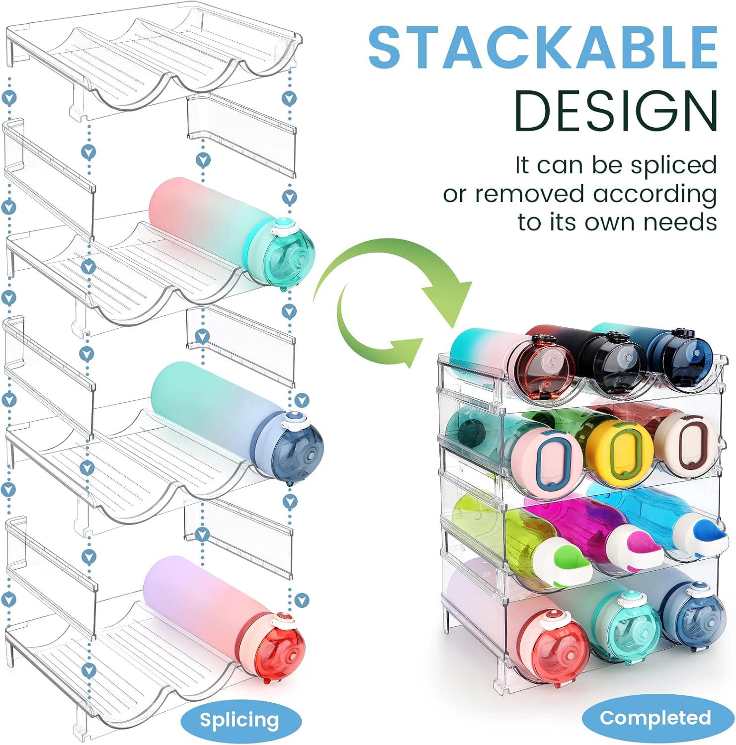 - Stackable Design: The water bottle storage rack can be easy to spliced or remove 2 to 4 pack according to your need