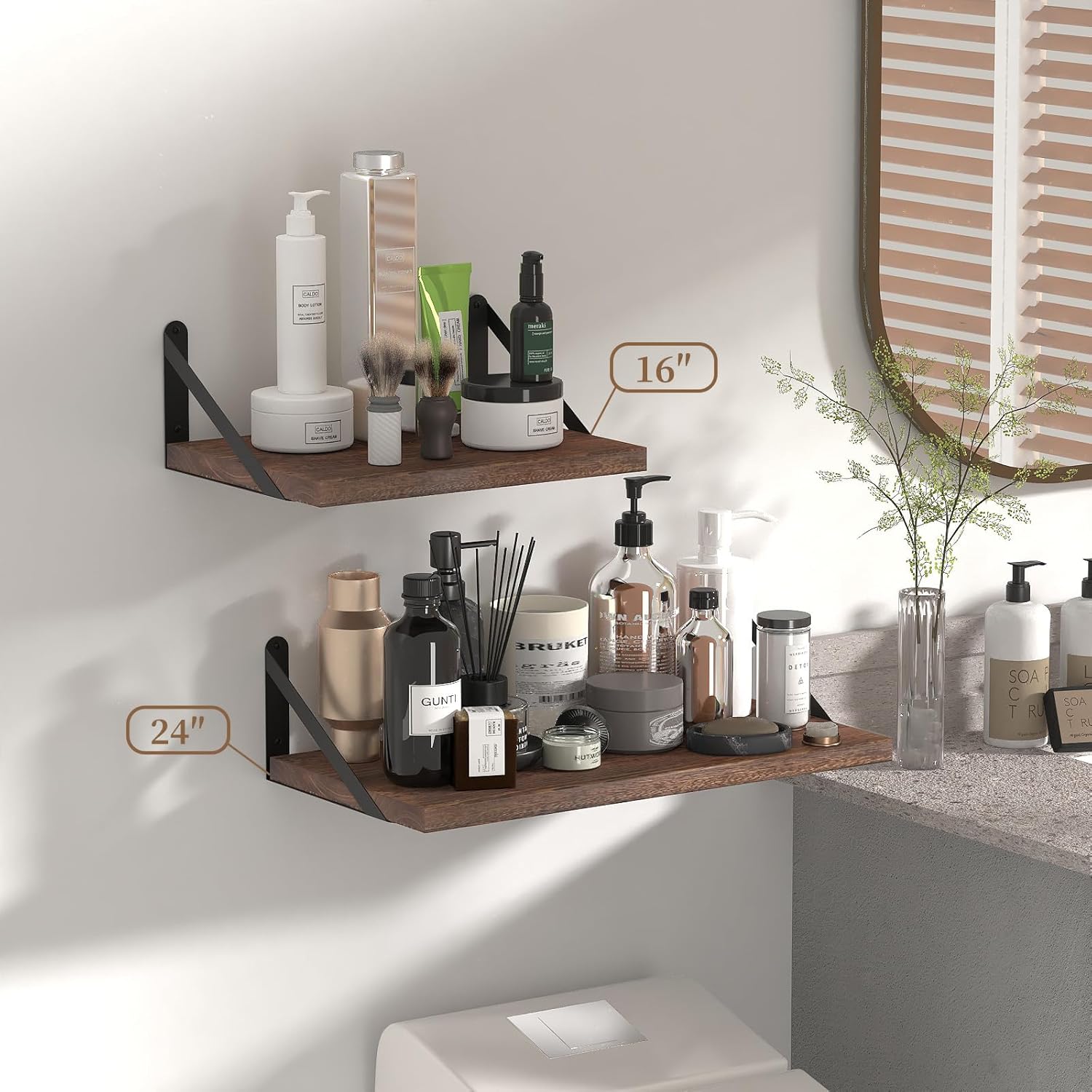 - Diverse Floating Shelves: The matte metal bracket can be installed either on the top or bottom of the shelf, providing various display options to suit your needs; Ideal for bathroom, bedroom, living room, kitchen, farmhouse, office, and dorm