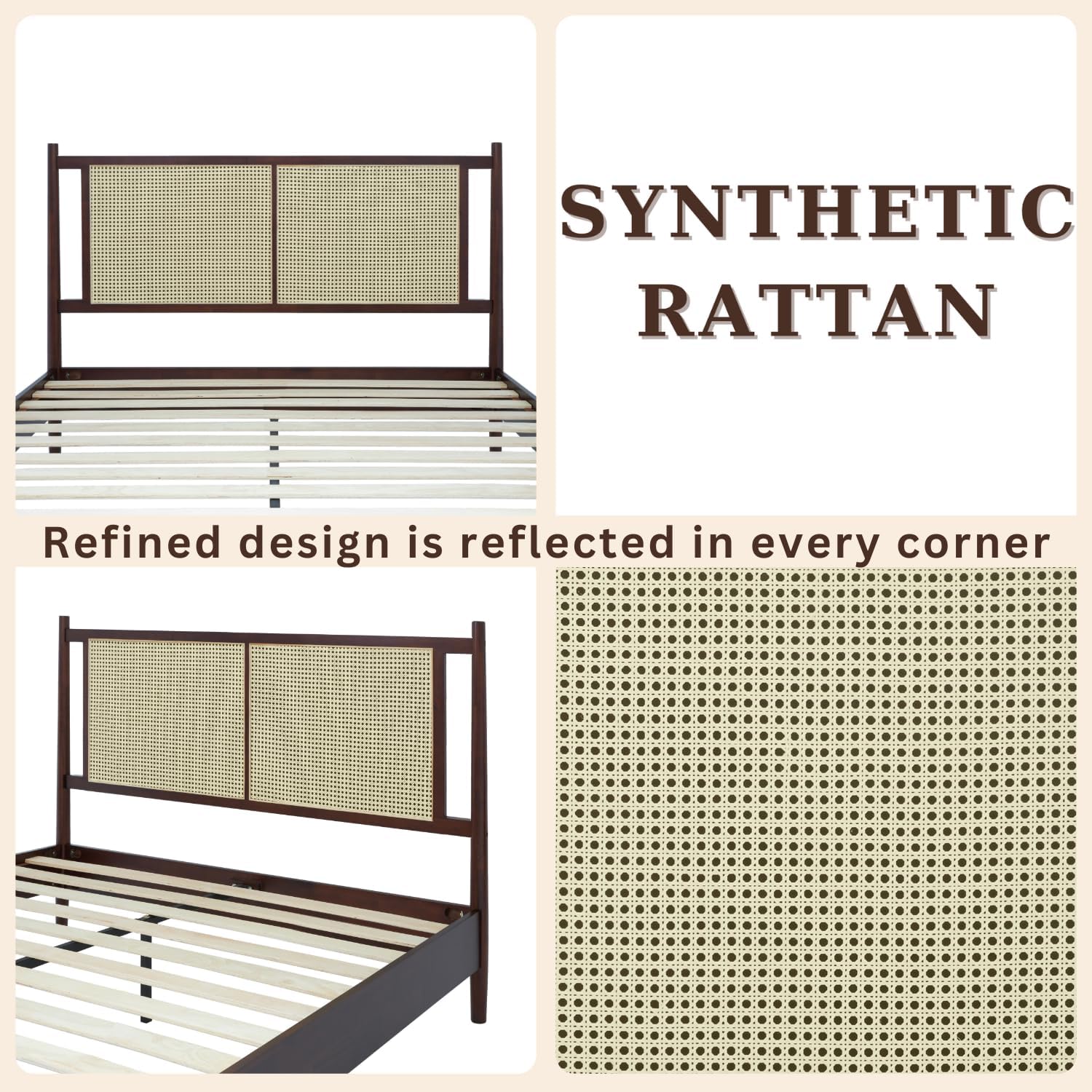 - SOPHISTICATED DESIGN: The handcrafted headboard features stunning lattice woven synthetic rattan, backed with a solid MDF wood for added support; Its slim cylindrical legs gradually shrink in size downward, creating a beautiful and proportionate design that suits many bedroom styles, such as boho, mid-century and rustic style