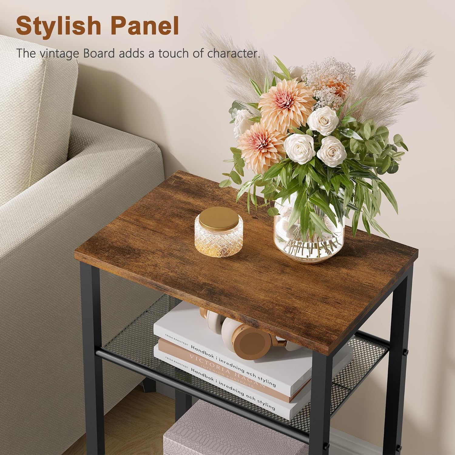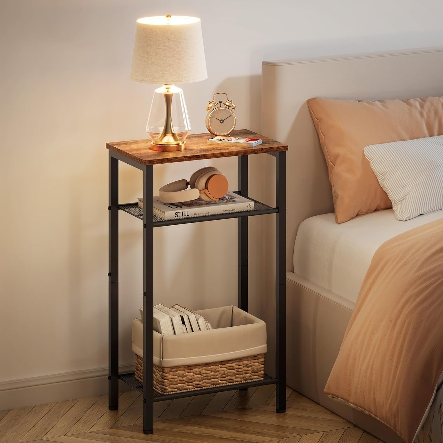 Hoctieon 2-Set 3 Tier End Table, Telephone Table Set of 2, Tall Side Table with Storage Set of 2, Small Nightstand for Small Spaces, Metal Frame, for Living Room, Bedroom, Sofa Couch, Rustic Brown