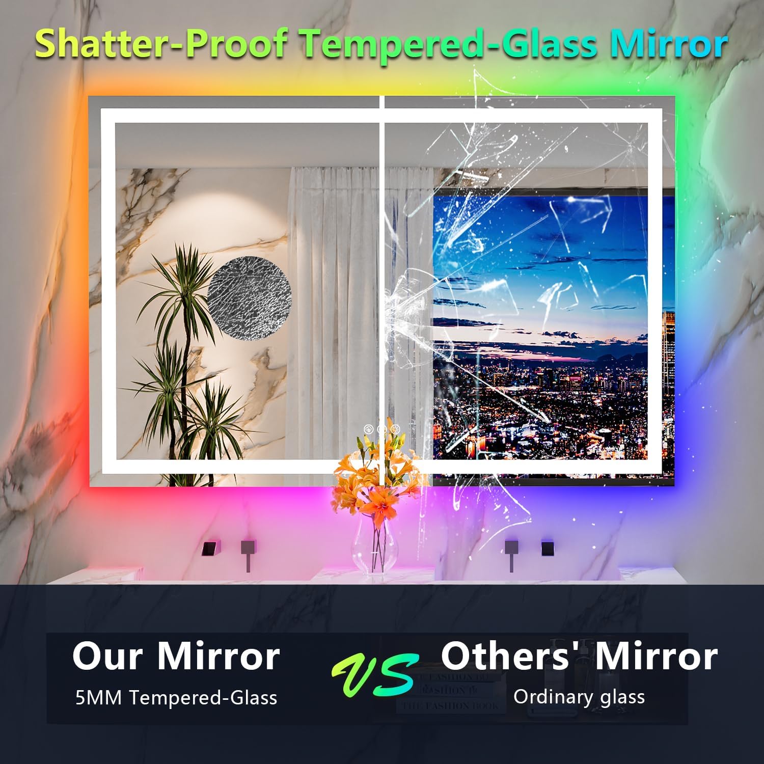 - 💎【3+8 Light Colors, Make a Difference】- This led mirror for bathroom has 3 front light modes: warm(3000K), white (4000K) and cold (6000K). RGB backlit has 8 light modes: warm / white / cold / flowing colorful / purple / red / green / blue. THE BACK LIGHT CAN BE WHITE ONLY! The muli color tone options are what makes this led vanity mirror and what makes your bathroom truly difference.