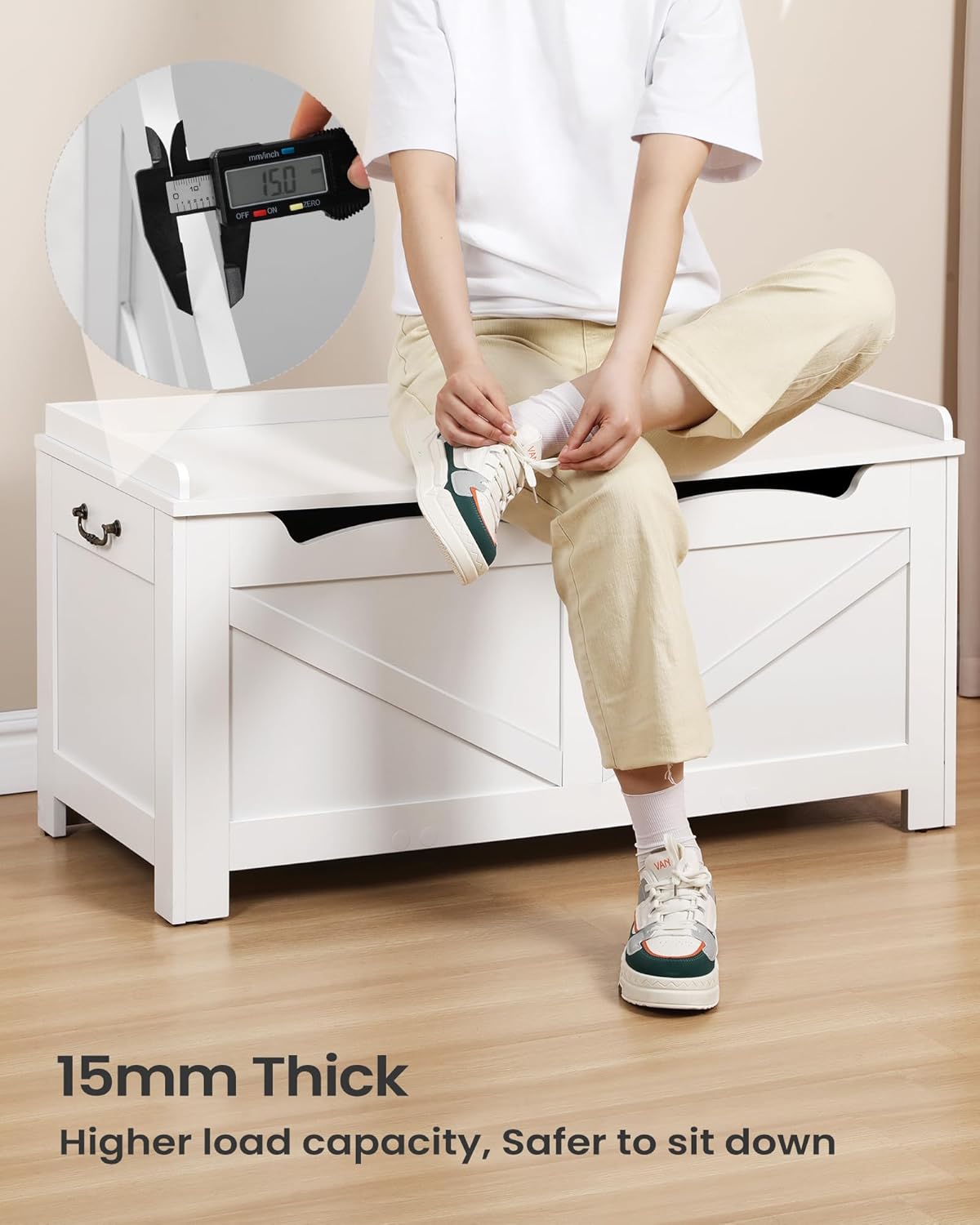 - 【Great Load Capacity】 The top plate of this storage box is 15mm thick and has a load capacity of 330lb, allowing you to sit on it and change your shoes with confidence. Storage Benches are made out of FSC-Certified wood