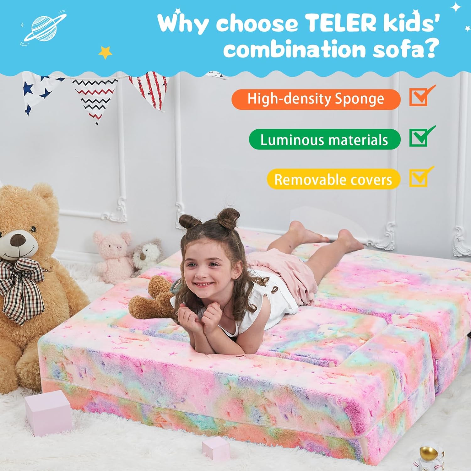Modular Kids Couch, Glow in The Dark Sofa 3 in 1 Fold Out Kids Sofa with Washable and Durable Covers for Boys, Rainbow Unicorn