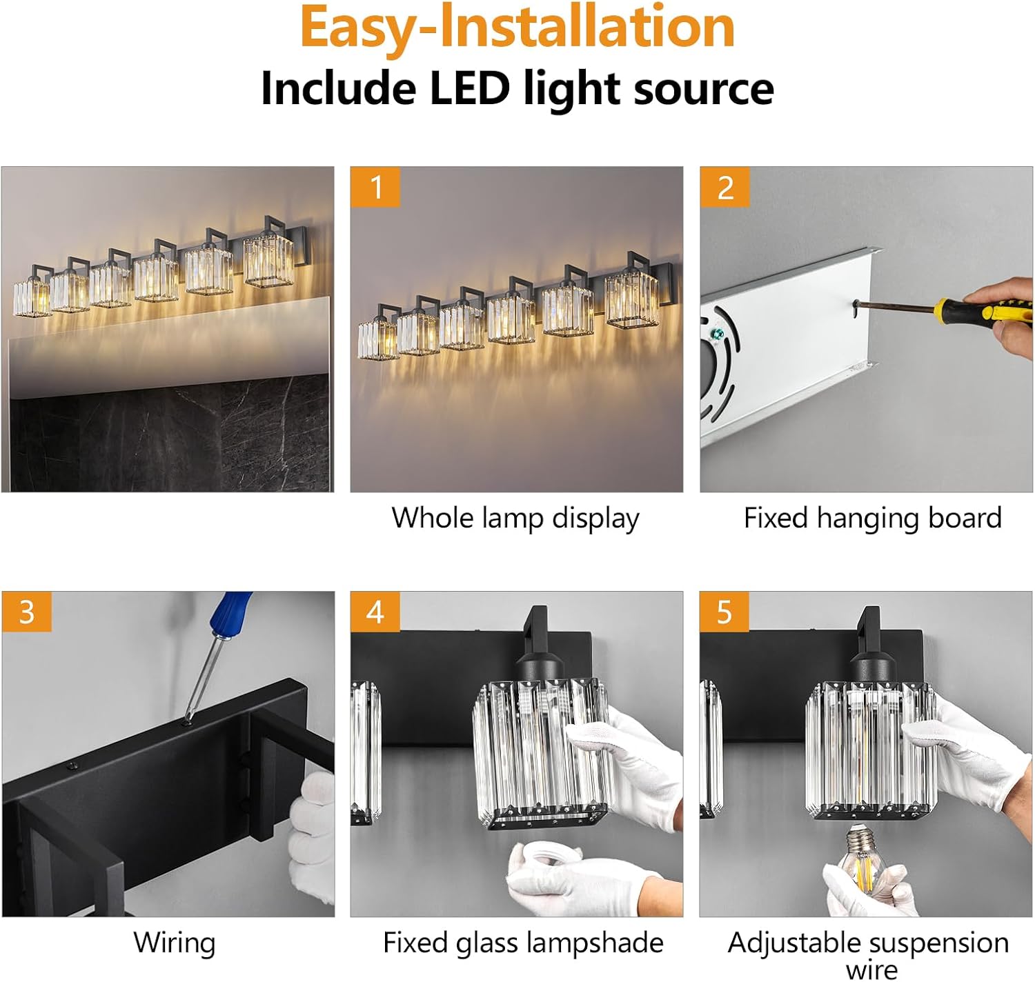 - 【Easy Installation】This is designed for US standard junction box, no complicated installation procedure is needed. All required parts are included in the package with additional replacement crystal strips. Note: For your safety, please install the vanity light under the guidance of an electrician.