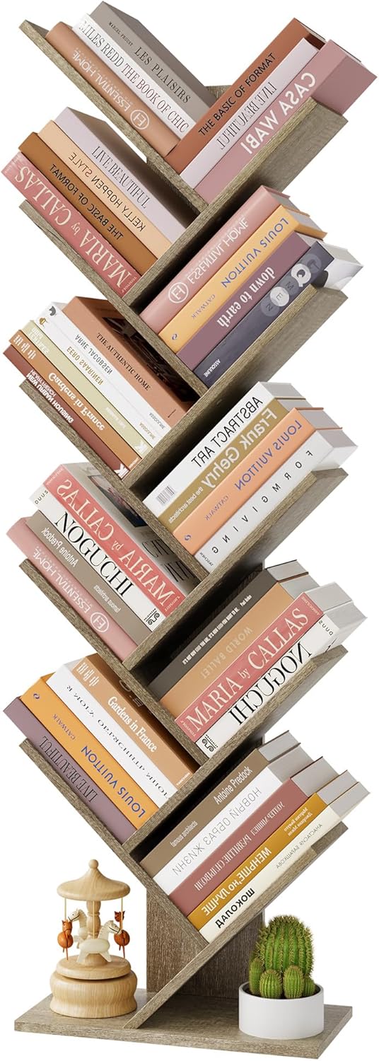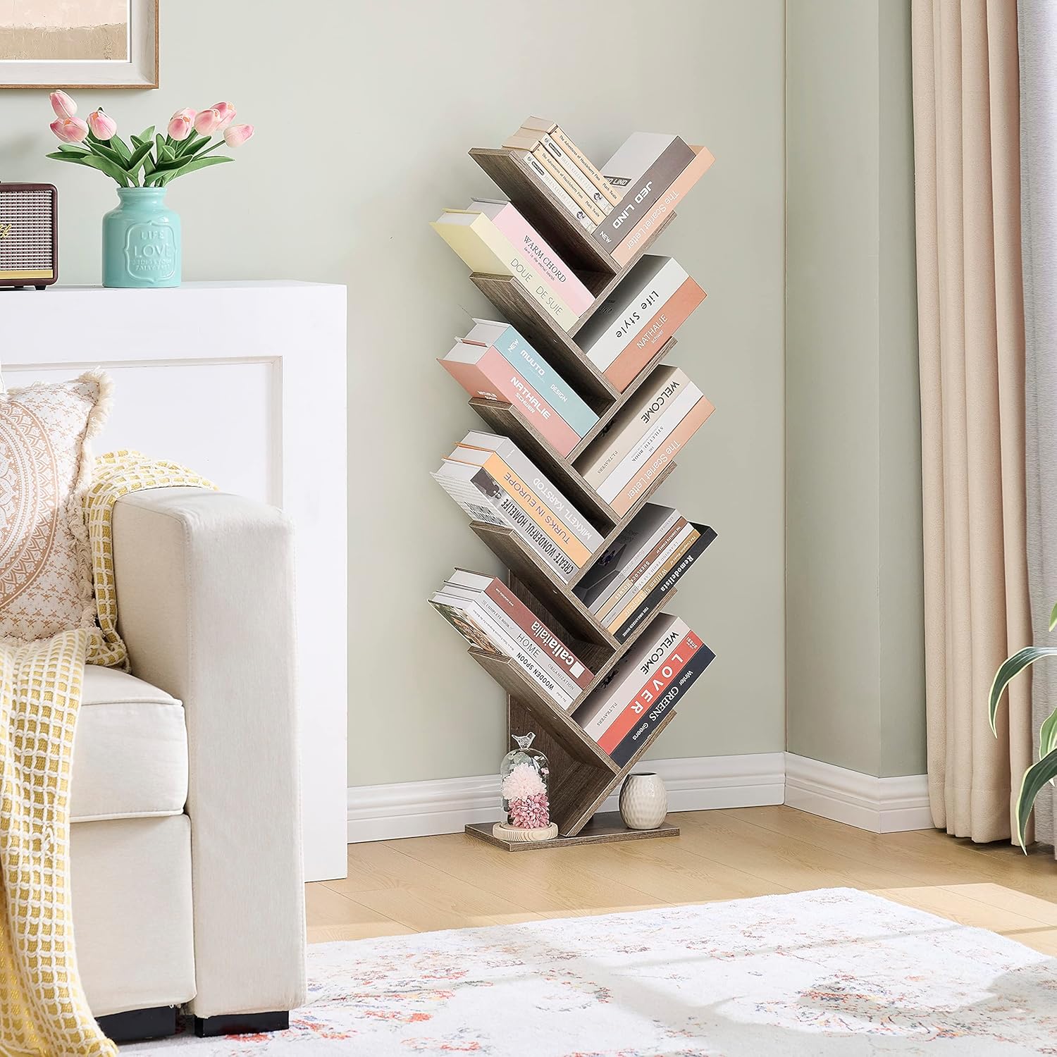 - 【Space Saving & Large Capacity】 This bookshelf is very compact with 10 open shelves, ideal for storing books, potted plants, CDs, magazines, videos, photo albums, crafts, or other favorite collections. This tree-shaped bookshelf takes up very little floor space. It is the ideal bookshelf for corners and small spaces.