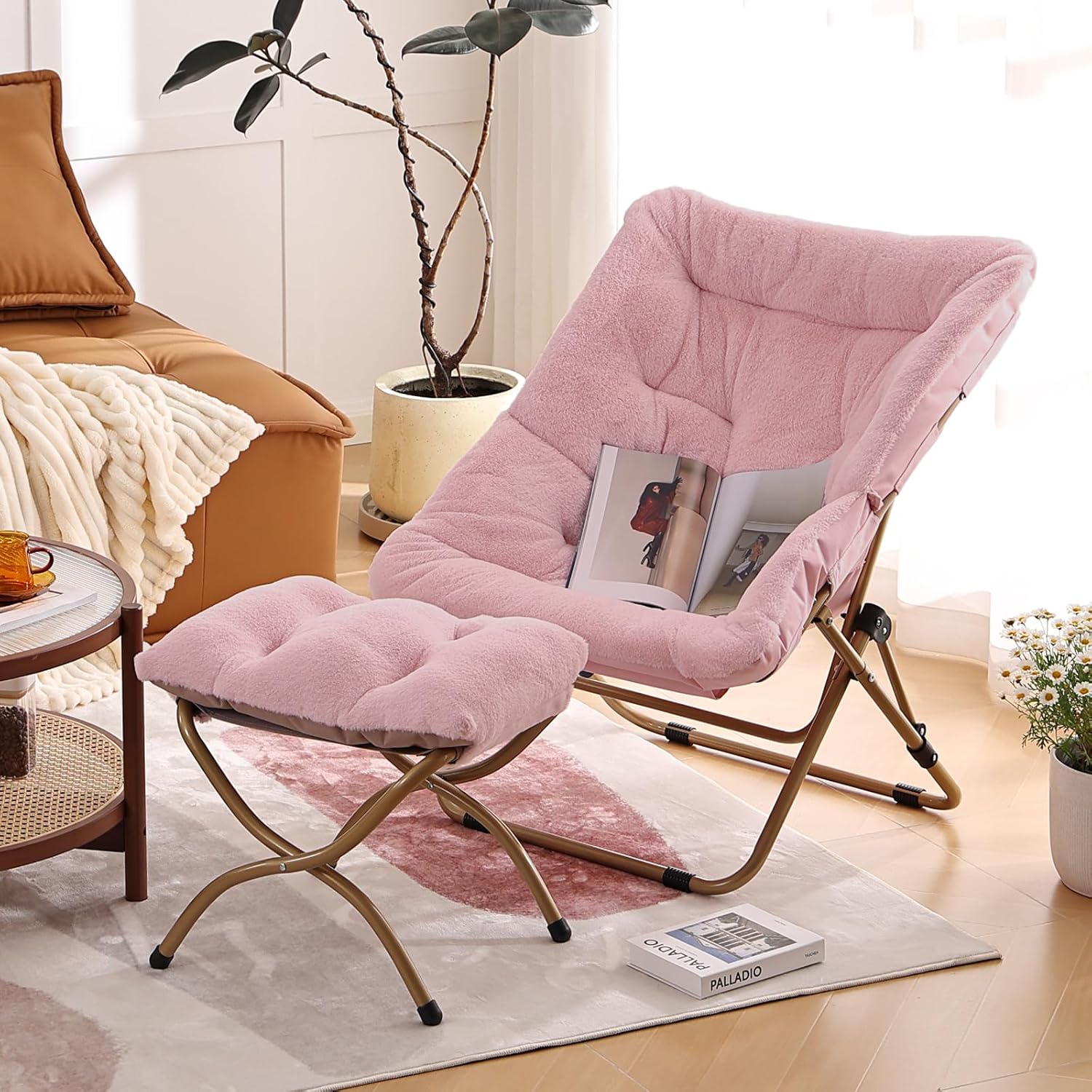 - Comfy Faux Fur Folded Chair with Ottoman: The comfy chair is made with luxurious premium faux fur, the comfy folded chair envelops you in comfort, creating a warm and inviting atmosphere. Its ergonomic design embraces your body, ensuring optimal support for a truly comfortable seating experience. This lazy chair will make a great choice for you to relax after a long day.