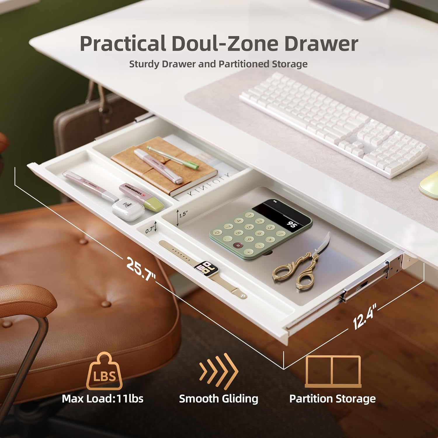 - Partition Drawers: The built-in pull-out drawers provide a hidden storage solution for easy desktop organization, giving you more space and less clutter