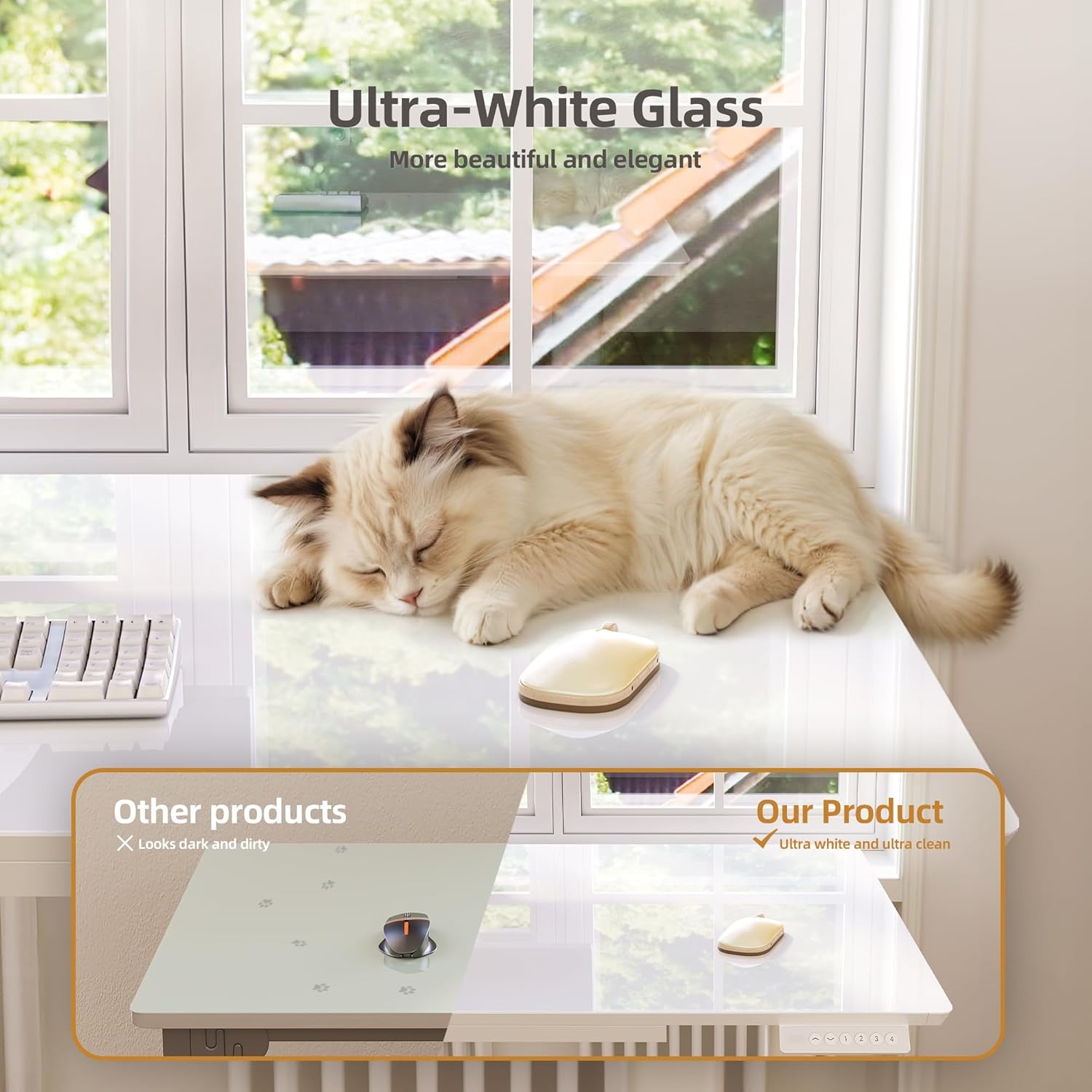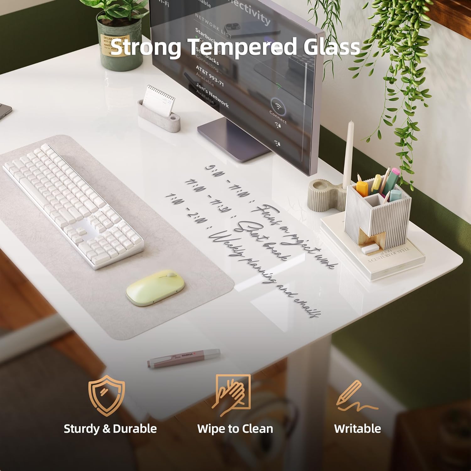 - One Piece Glass Table Top: The modern design of the tempered glass desktop adds elegance and durability to the standing desk. It is easy to clean and can even be used for writing. Please note that the clamping arm should not be used on top of the glass