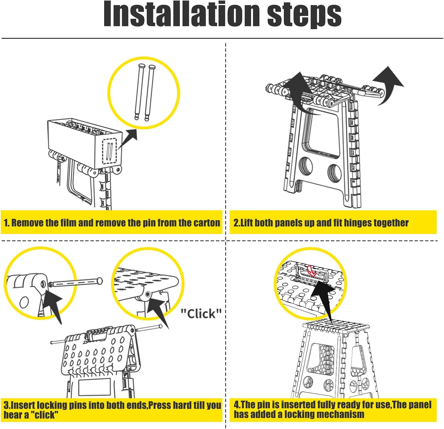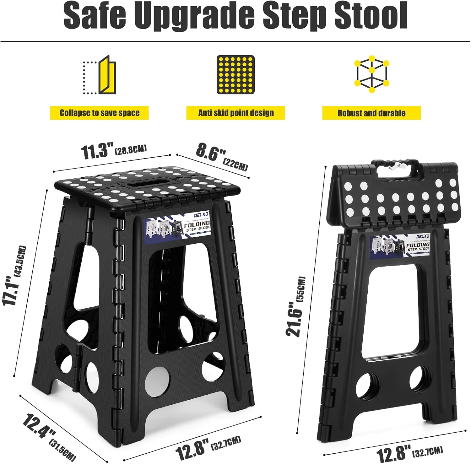 - Safe Upgrade Step Stool : Features improved the folding bar, it has been reinforced with locking pins and fixed hinges which can prevent from collapse inward while Steping on it.Delxo have designed a safety stop gap feature that allows the foldable stool to prevent being squashed, great for adults. Four round corner super safe protect your body from clashing. All of this design is put your safe first