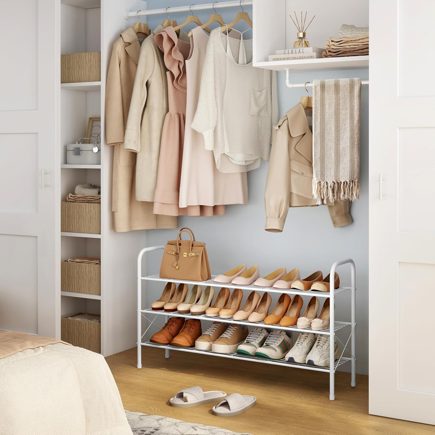 - ă3-Tier Designă: Three-layer shoe rack design is easy to use and maximizes storage space. You can arrange boots or shoes according to the height of each layer to keep your shoes organized and tidy. Say goodbye to the messy and unorganized arrangement.