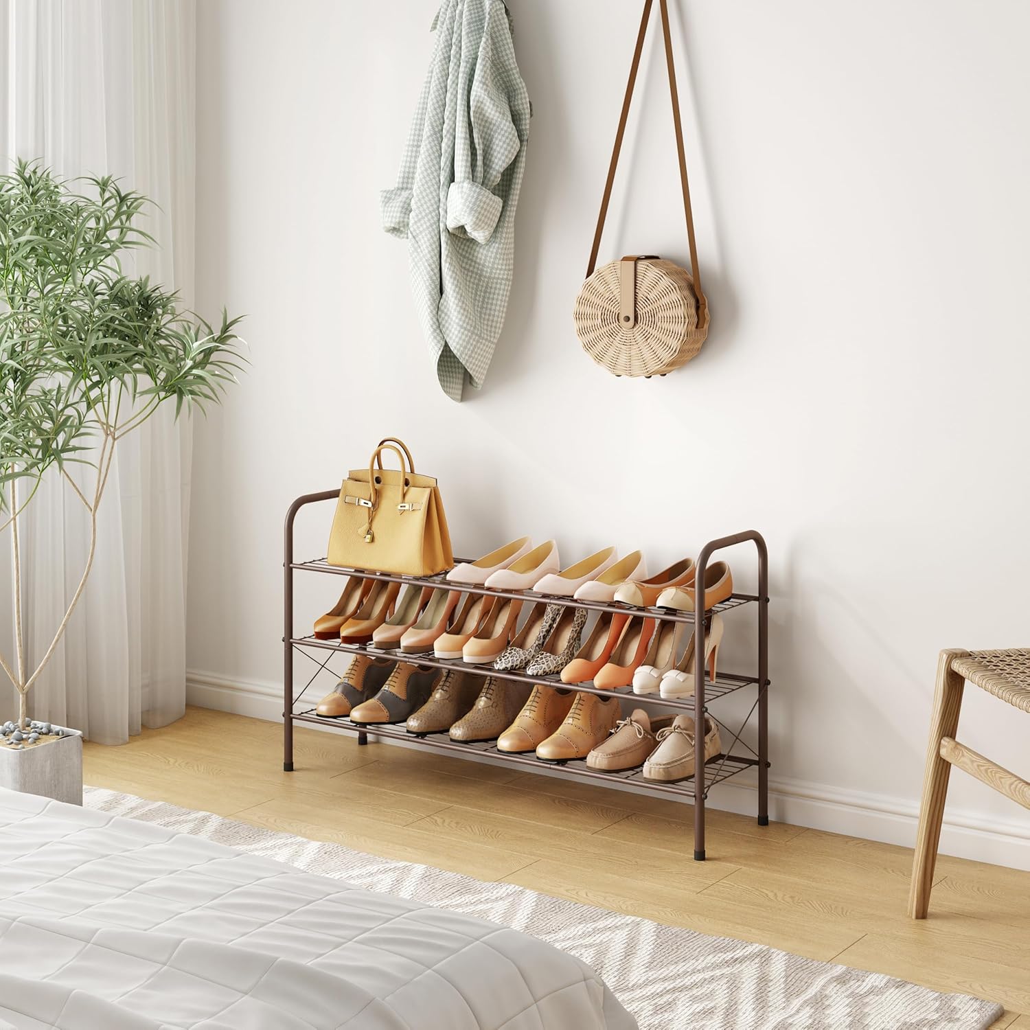 Hoctieon 3 Tier Mesh Style Shoe Rack, Entryway Shoe Shelf, Shoe Storage Organizer, Shoe Rack for Closet, Space Save for Bathroom, Garage, Hallway, Bedroom, Living Room, Brown