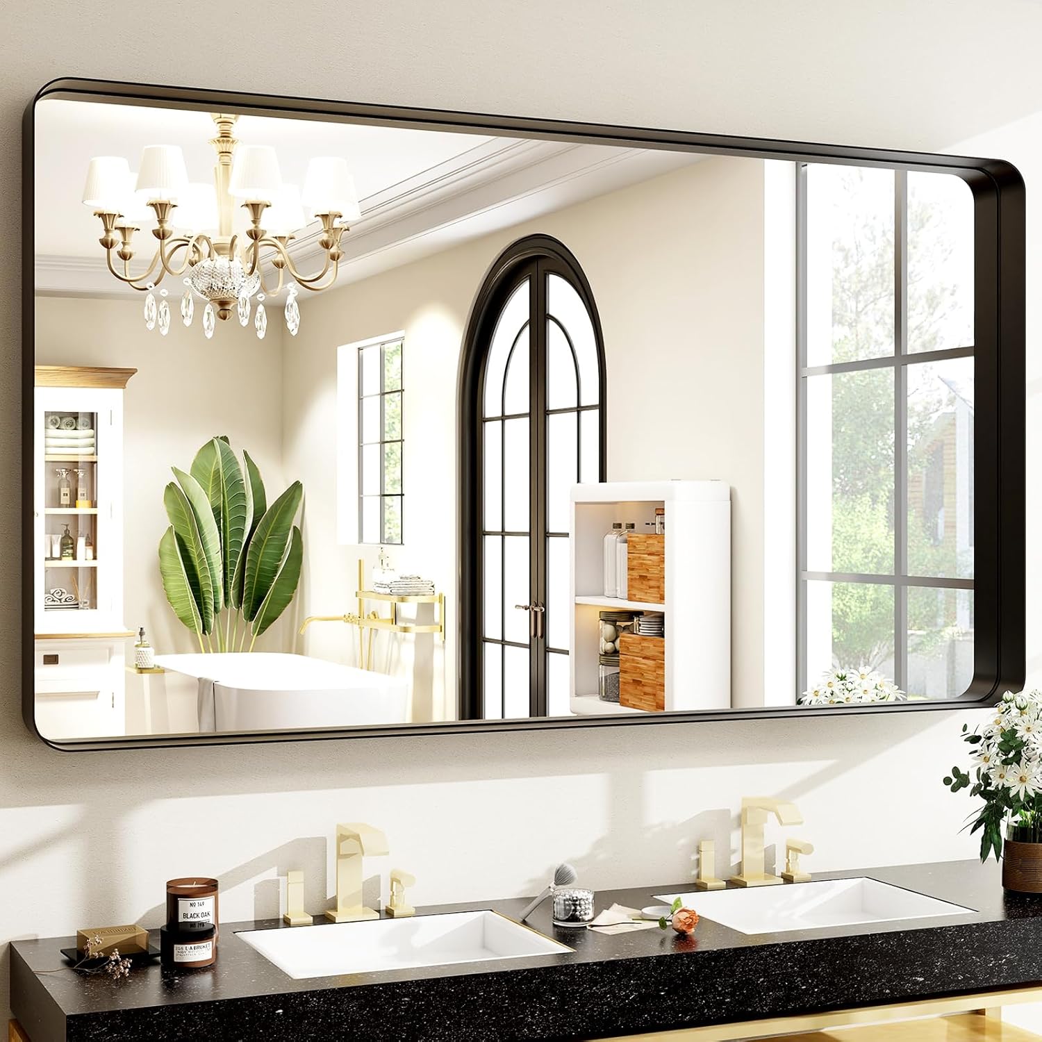 48"x30" Black Bathroom Mirror - Modern Black Mirror for Wall with Rounded Corners, Bathroom Mirrors for Vanity, Aluminum Alloy Framed Mirror Portrait or Landscape Hang