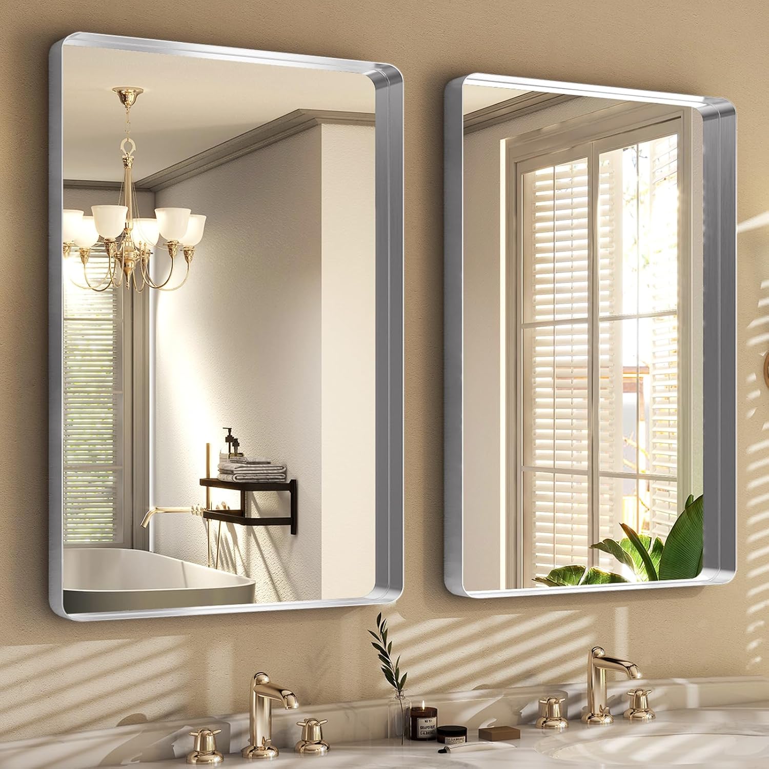 Silver Bathroom Mirror for Wall, 30x22 Inch Rectangular Aluminum Alloy Framed Mirror, Modern Wall Mounted Vanity Mirror for Bathroom, Vertical or Horizontal