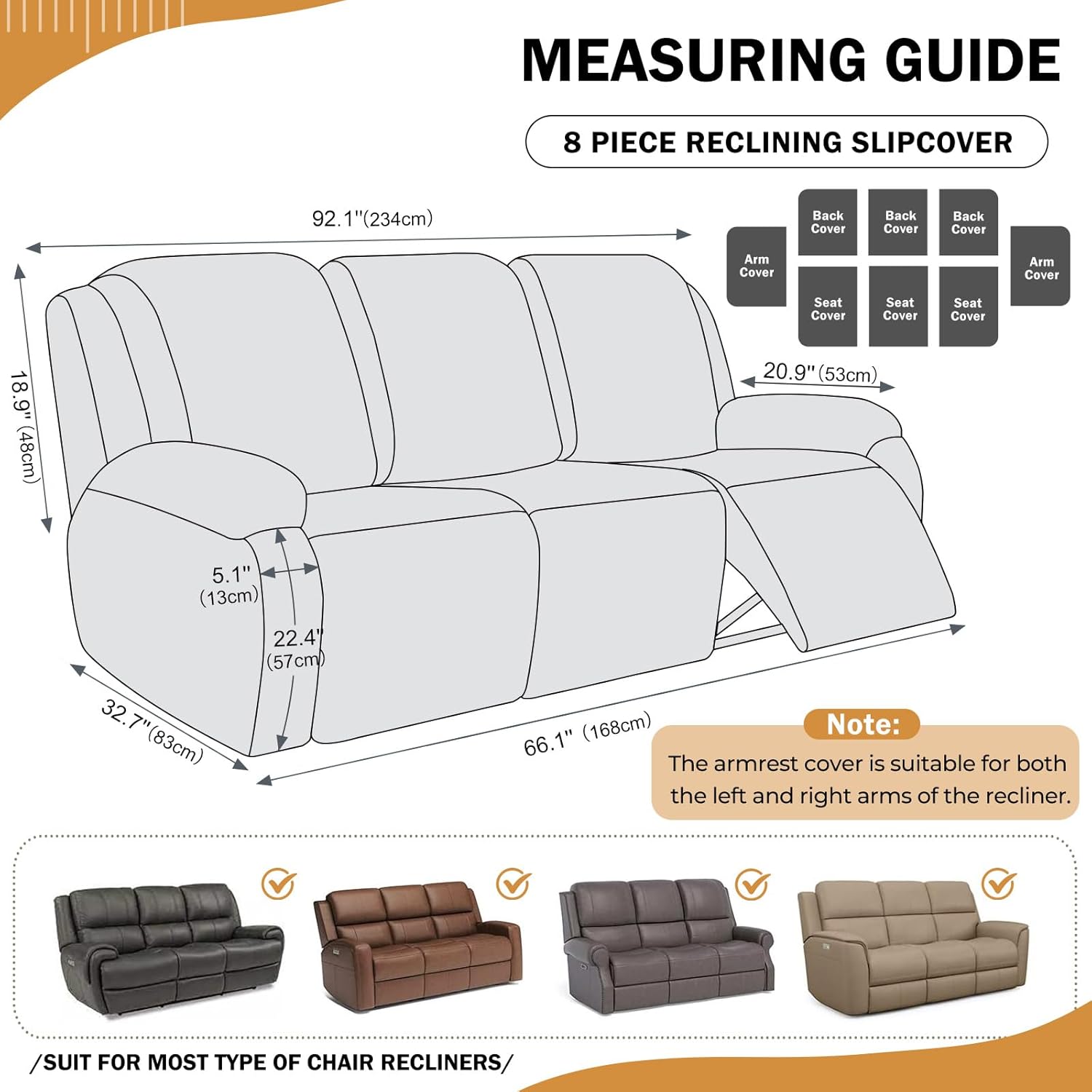 - Package Included: Solid color geometric 8-piece recliner cover contains 3 piece seat cover, 3 piece back cover and 2 pieces arm covers.