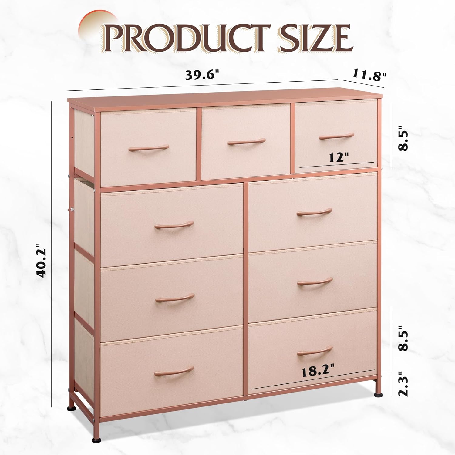- Overall Dimension: The fabric dresser measures 39.6" L x 11.8" W x 40.2" H. The storage tower comes with instructions and all hardware needed for installation, easy to assemble.