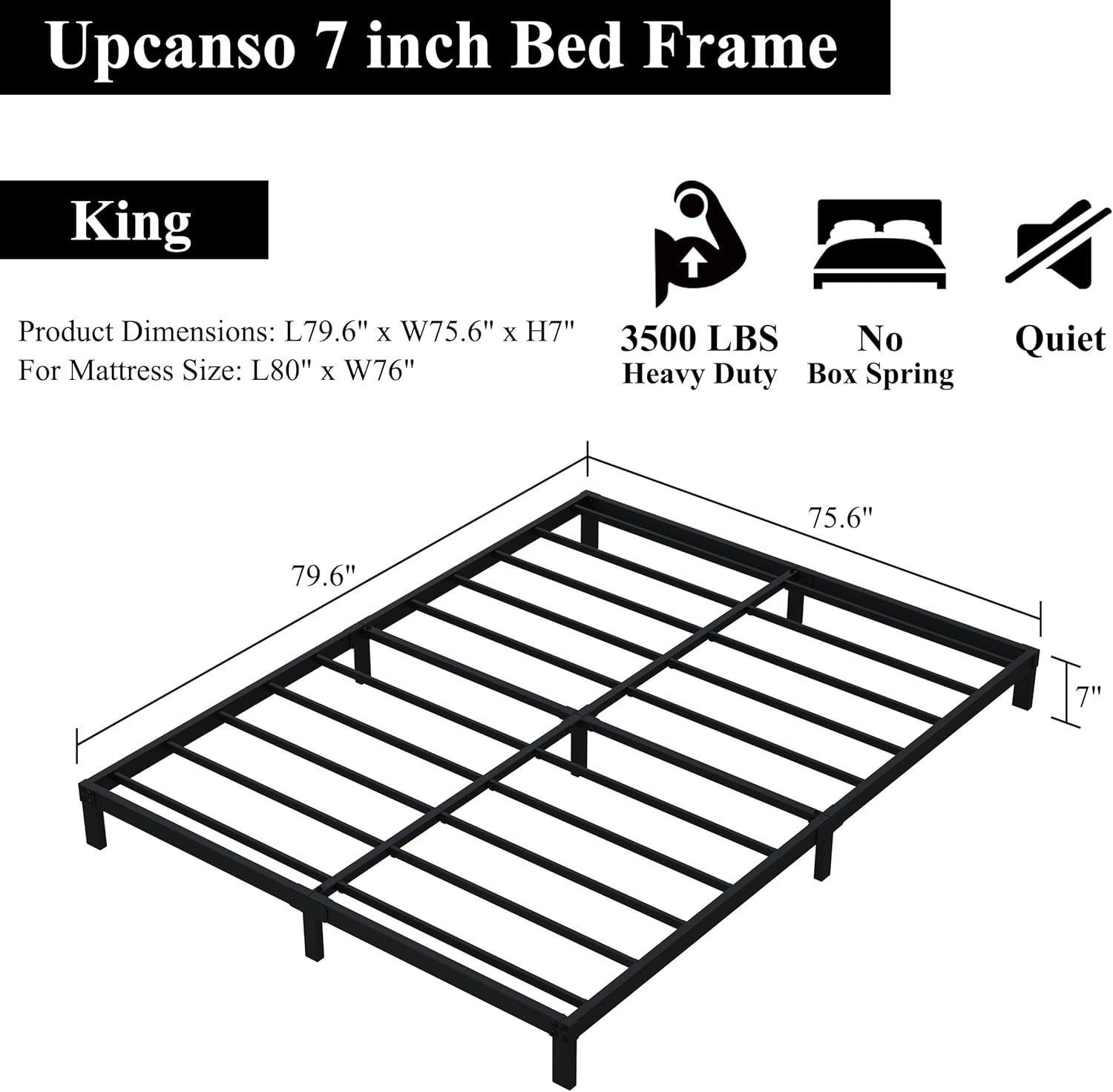 - Non slip and non scratches: All legs are installed with anti slip plastic foot pads to prevent the floor from scratches. The finish installed bed frame king size: L79.6"x W75.6"x H7", and for Mattress Size: L80"x W76".