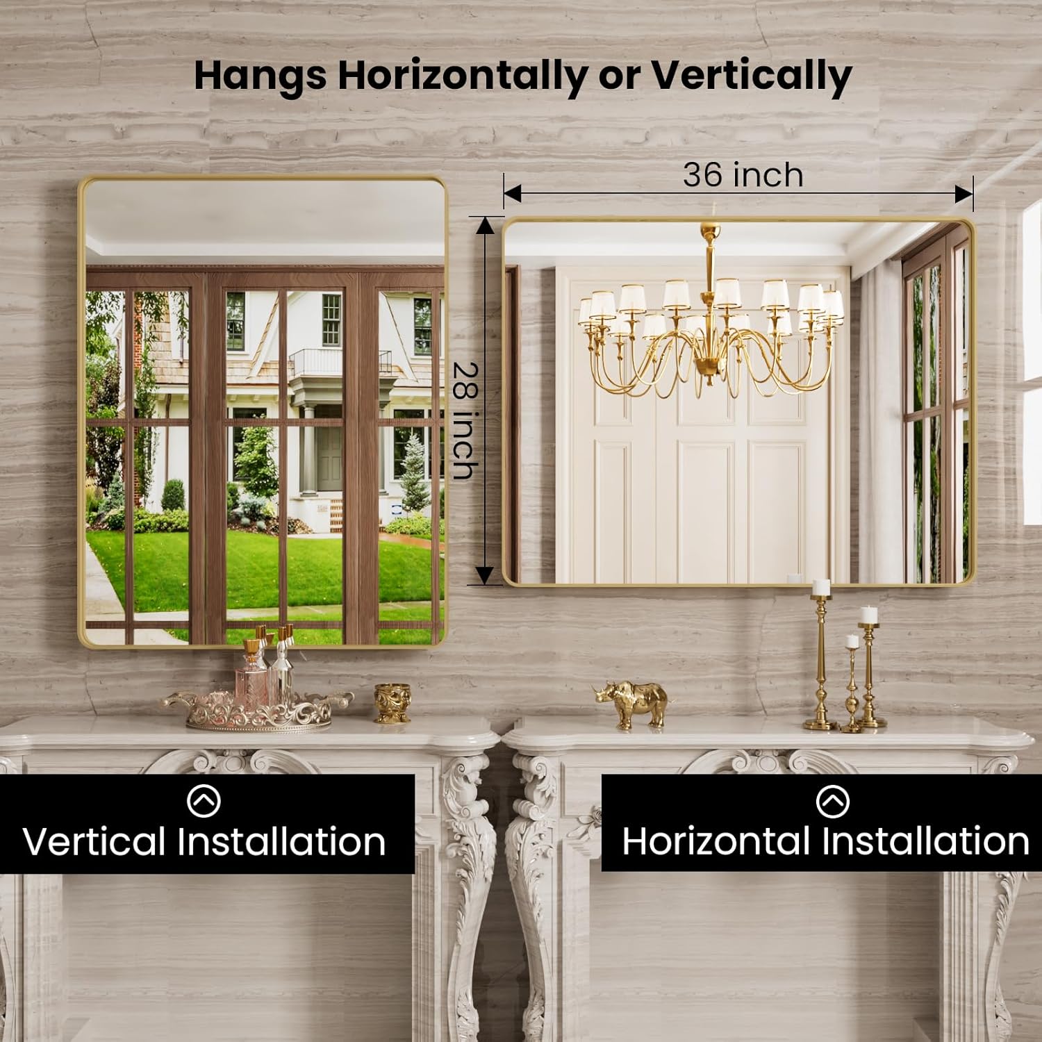 Gold Bathroom Mirror, 28x36 Inch Brushed Gold Metal Frame Mirror for Wall, Rounded Rectangle Bathroom Vanity Mirror, Tempered Glass, Anti-Rust, Horizontal/Vertical