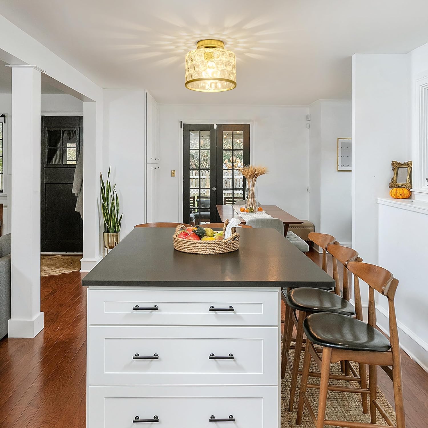 Gold Flush Mount Ceiling Light with Clear Hammered Glass lampshade, Farmhouse Ceiling Lights Fixture in Satin Brass for Kitchen Bathroom, Bulb not Included