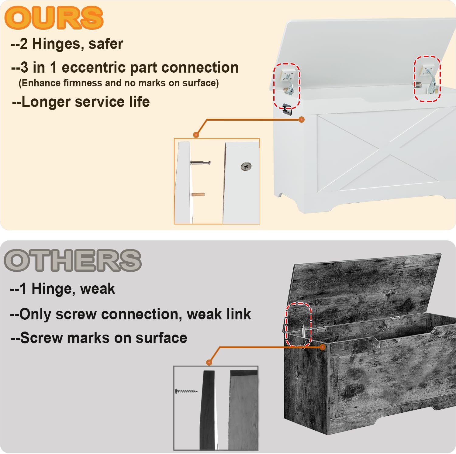 - 2 Safety Hinges, Steadier - The large storage chest is equipped with 2 advanced safety hinges that can stop at any position, allowing you to open and close it slowly without closing suddenly and pinching your fingers. The maximum opening angle is 90°