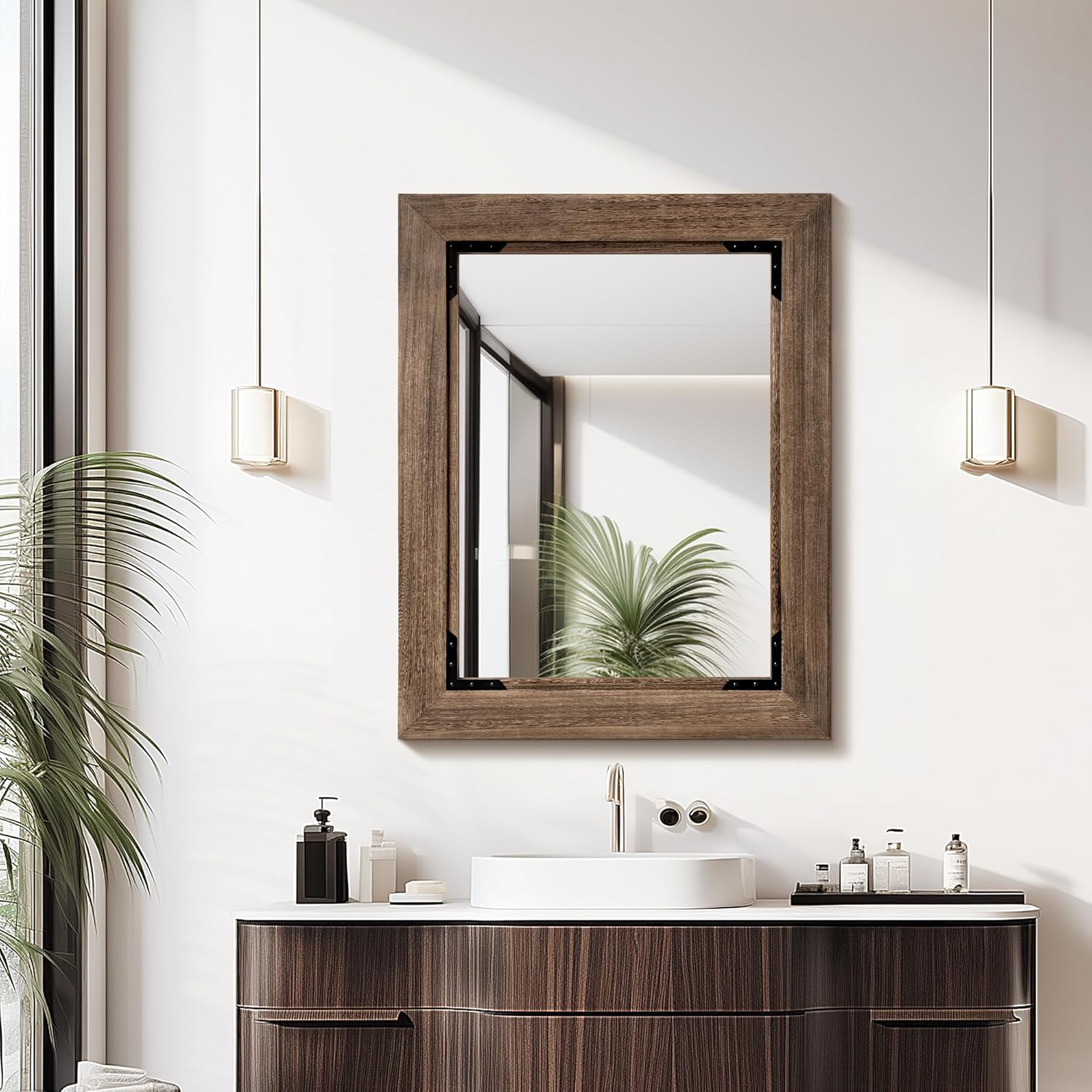 28"x36" Solid Wood Bathroom Mirror Tempered Glass for Wall Mounted, Rustic Wood Frame Wall Mirror Decorative for Living Room Bedroom Vanity Mirror, Rustic Brown