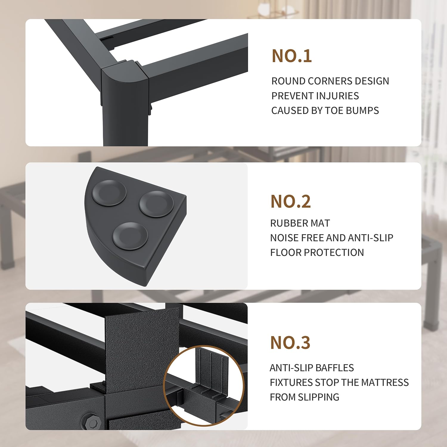 - Special Feature : Rounded Corners, Mattress Slide Stopper, Anti-slip Rubber Gaskets, Heavy Duty Metal, Steel Slat Support, No Box Spring Needed, Easy Assembly Rounded Corners, Mattress Slide Stopper, Anti-slip Rubber Gaskets, Heavy Duty Metal, Steel Slat Support, No Box Spring Needed, Easy Assembly