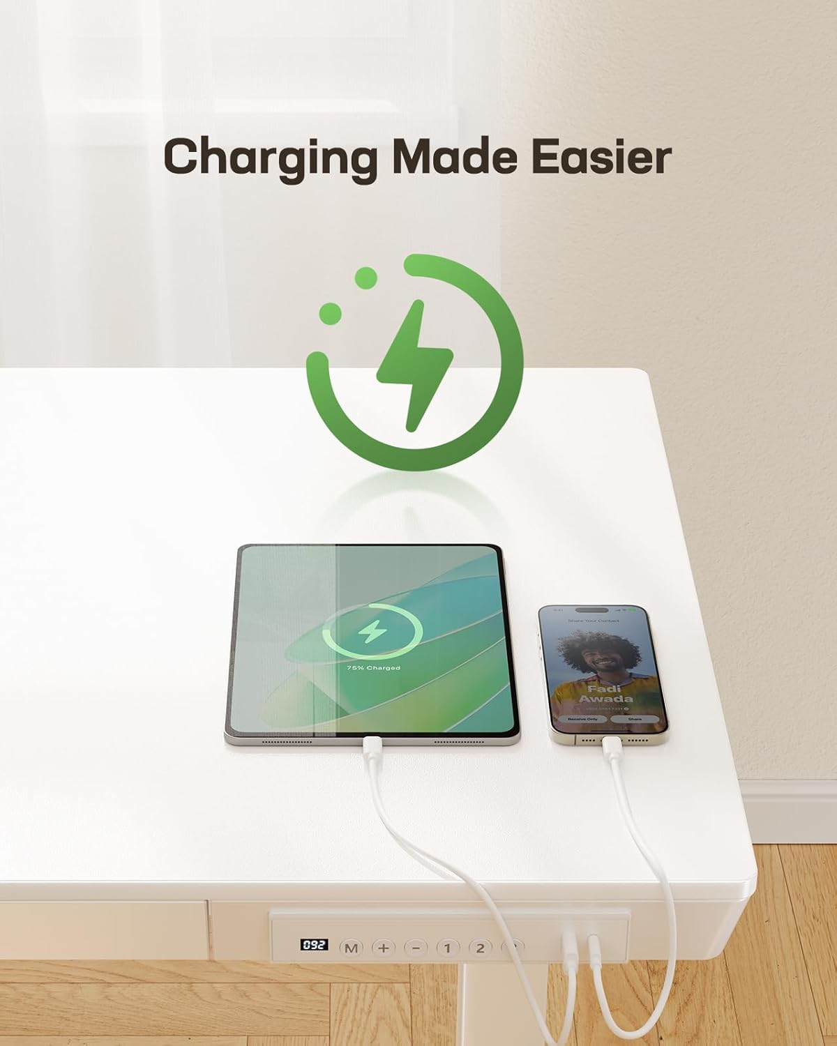 - Stay Charged, Stay Connected: The height-adjustable desk features integrated USB-A and Type-C charging ports on the front panel. Keep your essential devices including smartphones, tablets, or smart watches fully powered and easily accessible when needed.