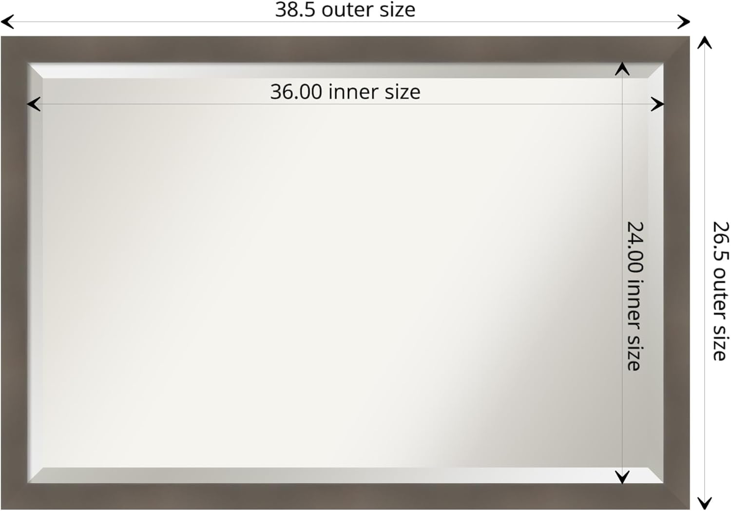 - MIRROR DETAILS: This mirror features premium glass for a clear, undistorted image and is finished with a beveled edge to give the glass a decorative touch. The overall size of this wall mirror measures exactly 38.5 x 26.5 inches, including the frame. Its reflective area measures 36 x 24 inches.