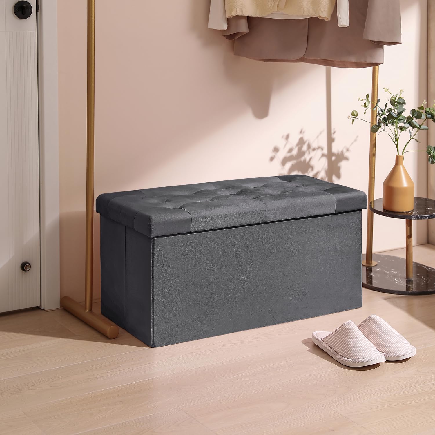 - ćSECONDS TO ASSEMBLEć: The storage chest can be easy set up and assemble in few seconds, suitable for living room, bedroom, entryway, lounge and more. Easily folded flat when not in use, keep it behind the door to saving space.