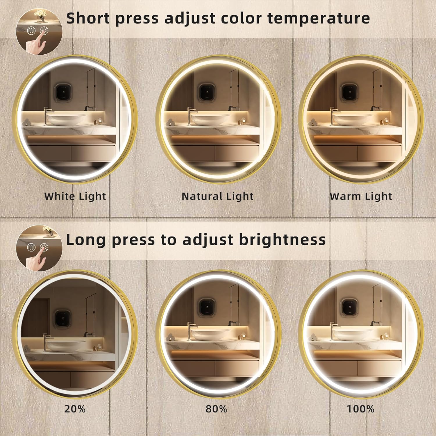 - 【3 Color Changeable & Brightness Dimmable】The smart lighted mirror is accessed to stepless color temperature and brightness adjustment. It's simple to operate by long-pressing the button "◎" to adjust the brightness and short-pressing the same button to change the color temperatures. There are 3 color temperature for option, warm light (3000k), natural light (4000k), and white light (6003k).