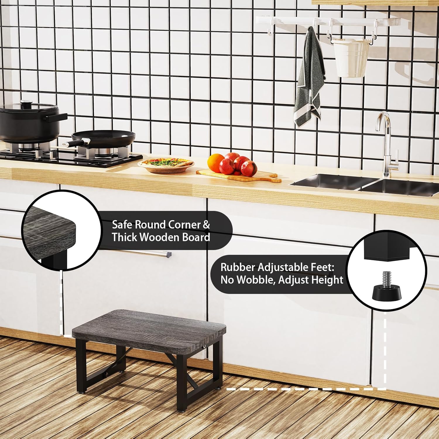 One Step Stool, Wooden Foot Stool for Adults, Small Stepping Stool for Bed and Closet, Heavy Duty Step for Kitchen, Dorm, and Indoor Use, Dark Gray