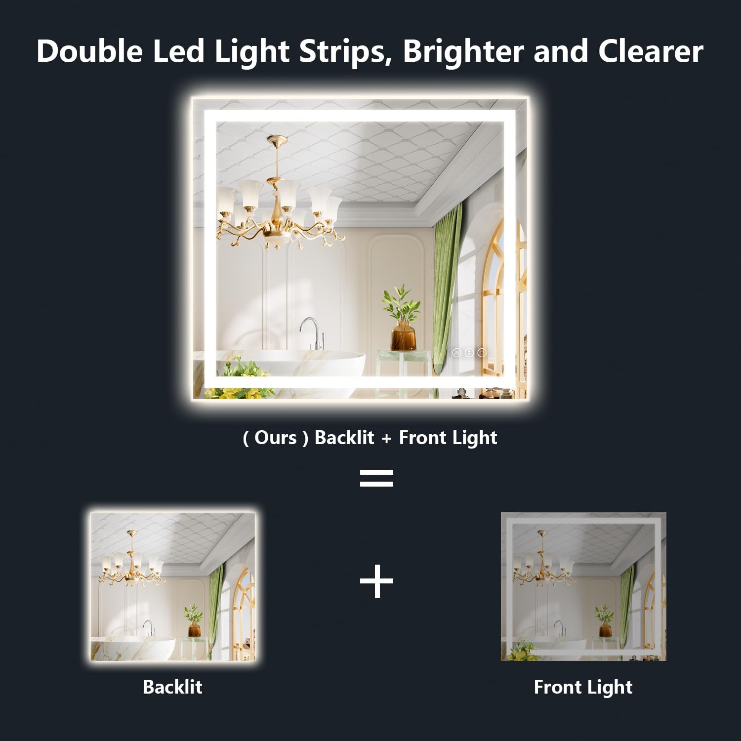 - 🔆【Backlit+Front-lit, Brighter and Clearer】- Yeelait LED Mirror for Bathroom is designed with a combination of front-lit mirror and backlit mirror, simultaneously emits front lighting and side ambient lighting, which is twice or more brighter than ordinary lighted bathroom mirror. Our LED bathroom mirror are bright enough for makeup, shaving or beauty care. No dark, no shadow, supper clear. The modern look and design is perfect for your bathroom remodels and upgrades.