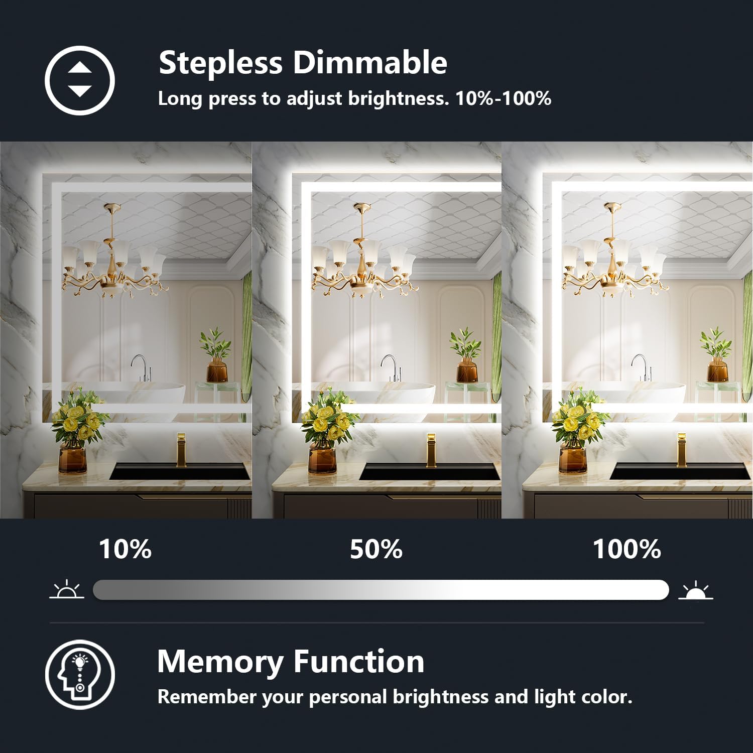 - ✨【Color Changeable & Brightness Adjustable & Memory】- Yeelait lighted mirrors for bathroom wall features multiple light settings that are easily controlled with sensitive touch buttons. Short press the button to change the light color: White (6000K) - Neutral (4000K) - Warm(3000K), long press the button to dim the brightness to your comfortable level (100%~10%). The Smart Memory Function will record the lighting setting and keep the previous lighting status after turning off and on.