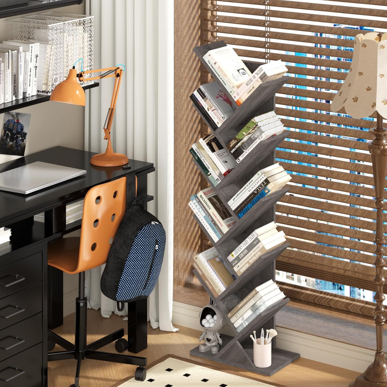 10 Tier Tree Book Shelf, Floor Standing Wood Bookshelf for Narrow Space, Storage Organizer Bookshelves for Books/CDs/Magazine, Bookcase with Shelves for Home Office, Living Room - Light Grey