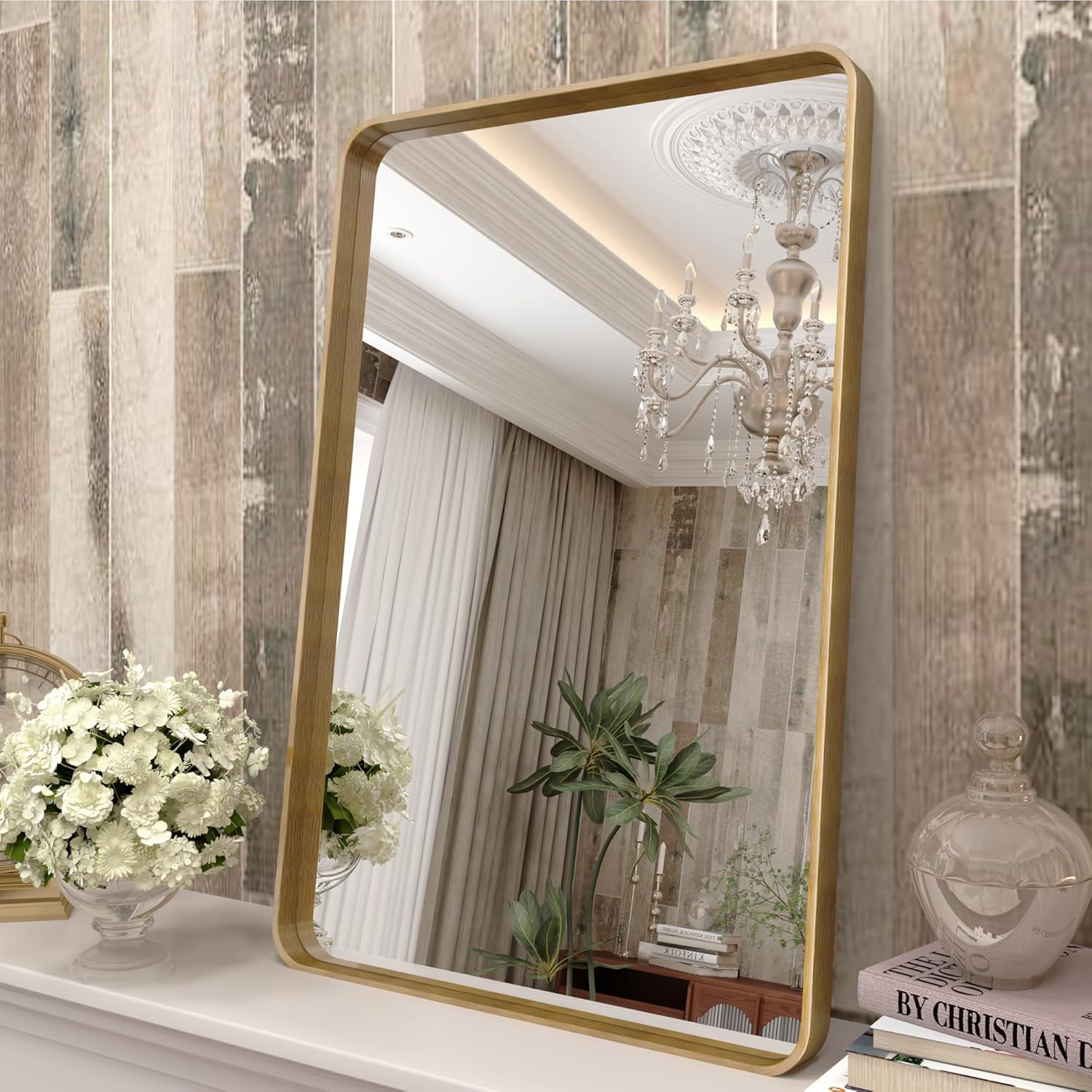 16x24 Gold Bathroom Mirror, Rounded Rectangle Gold Framed Mirror, Brushed Gold Brass Bathroom Vanity Mirror, Anti-Rust, Hangs Horizontally or Vertically
