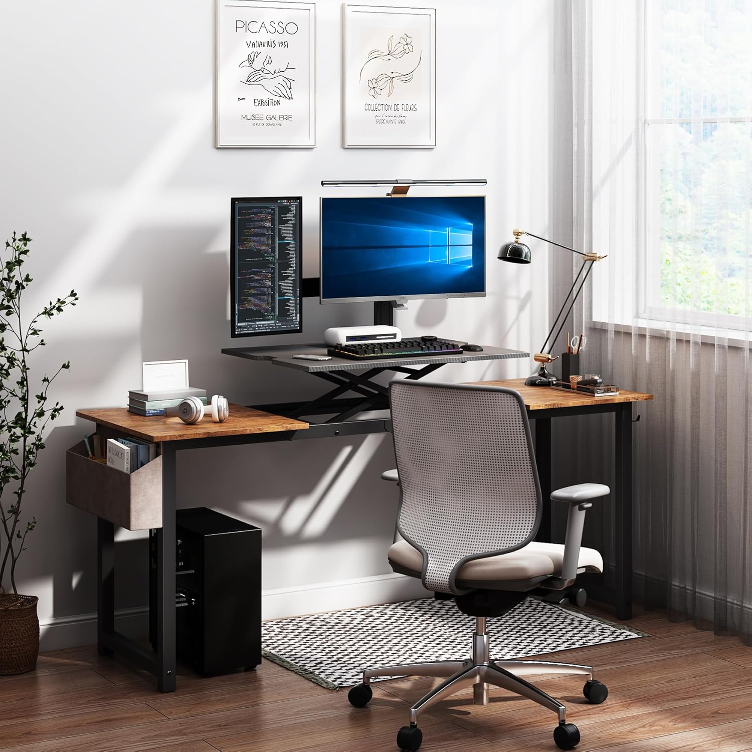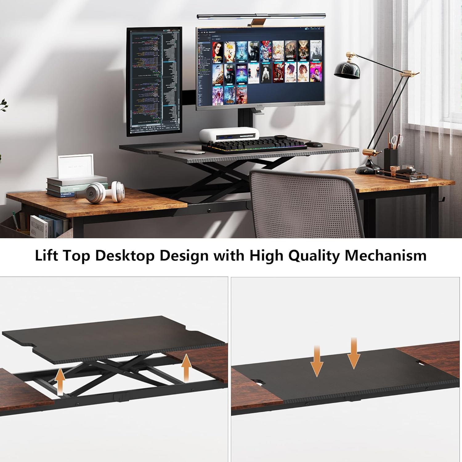 - Our 71-inch adjustable computer desk allows you to easily adjust the height of the desk to your desired position. The lift system raises and lowers the desk, allowing you to switch between sitting and standing positions with ease.