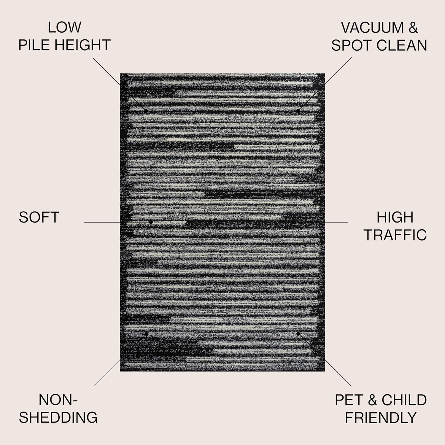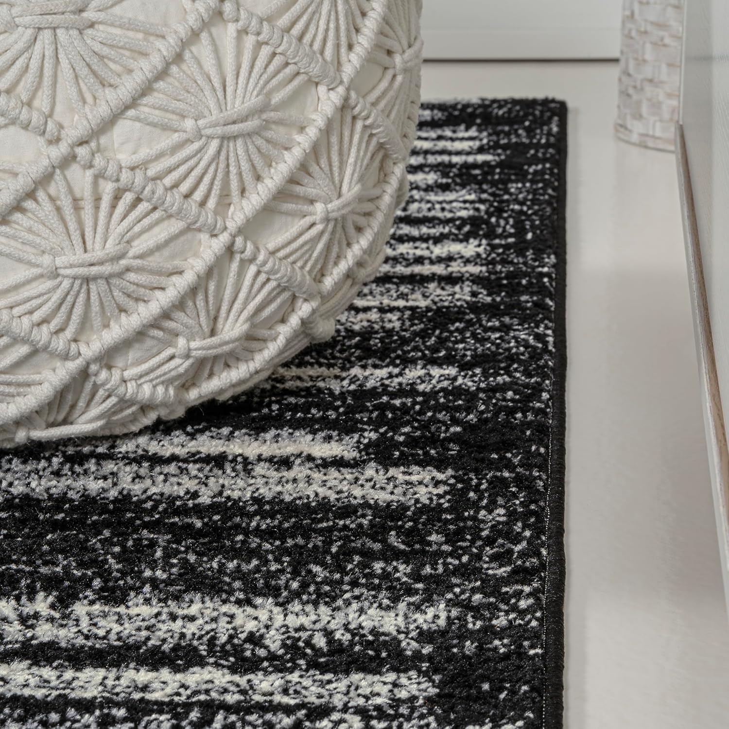 - The black and cream color scheme reproduces the look of neutral, mid-century tribal rugs