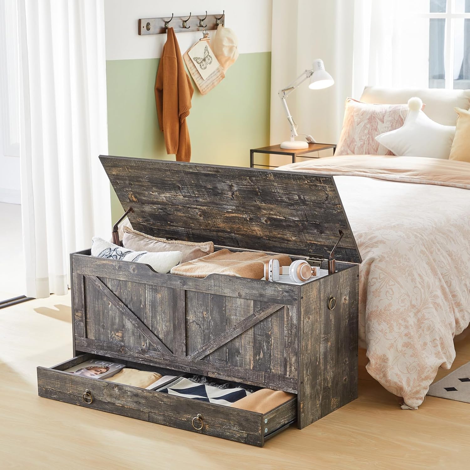 HOOBRO Storage Chest, 39.3" Toy Chest with Drawer, Wooden Storage Bench, Sturdy Entryway Bench Supports 220 lb, Shoe Bench, Safety Hinge, U-Shaped Opening, Easy Assembly, Vintage Gray VP710CW01G1