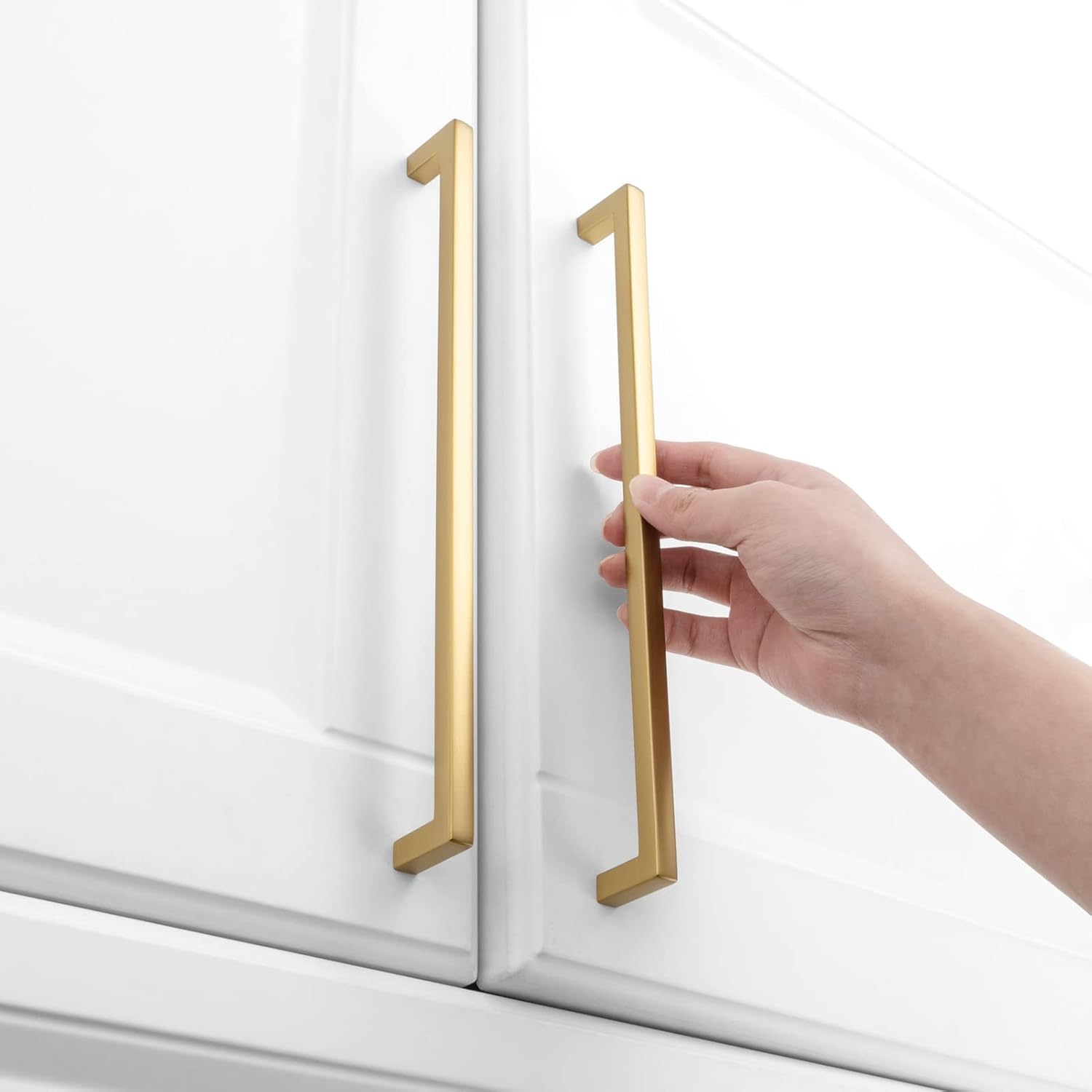 - Pack of 5 brushed gold square bar cabinet pull handles, solid metal hardware.