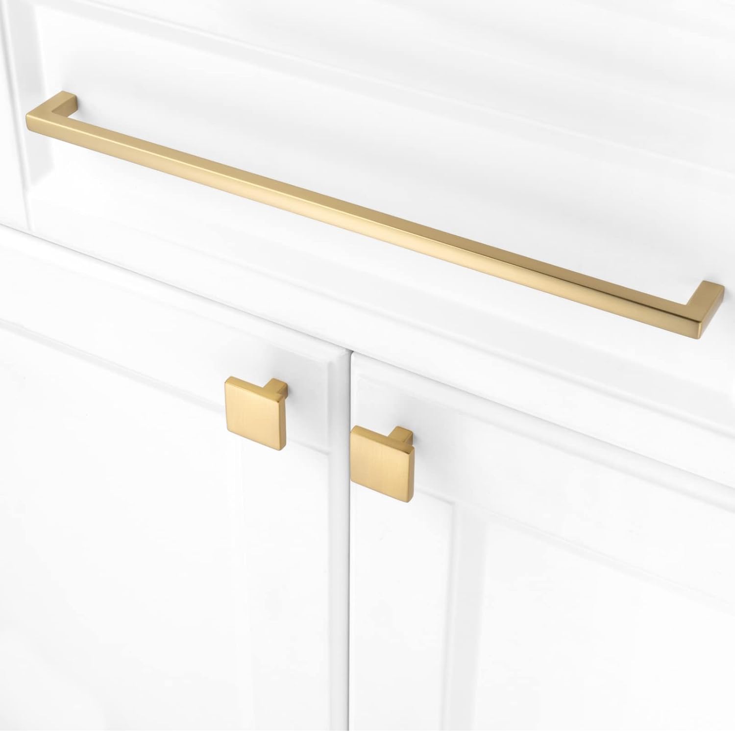 - Pack of 5 brushed gold square bar cabinet pull handles, solid metal hardware.