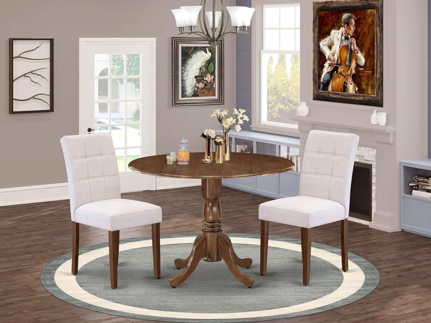 - MODERN DINING TABLE SET: Our thoughtfully crafted 3-piece dining set, specifically created for your kitchen. This collection comprises a Round-dropleaf dining table and 2 dining chairs, showcasing Polyester Fabric upholstery of exceptional quality for a comfortable seating experience. Its modern industrial aesthetic , coupled with sturdy 4 wooden legs, imparts an element of elegance to your dining space.