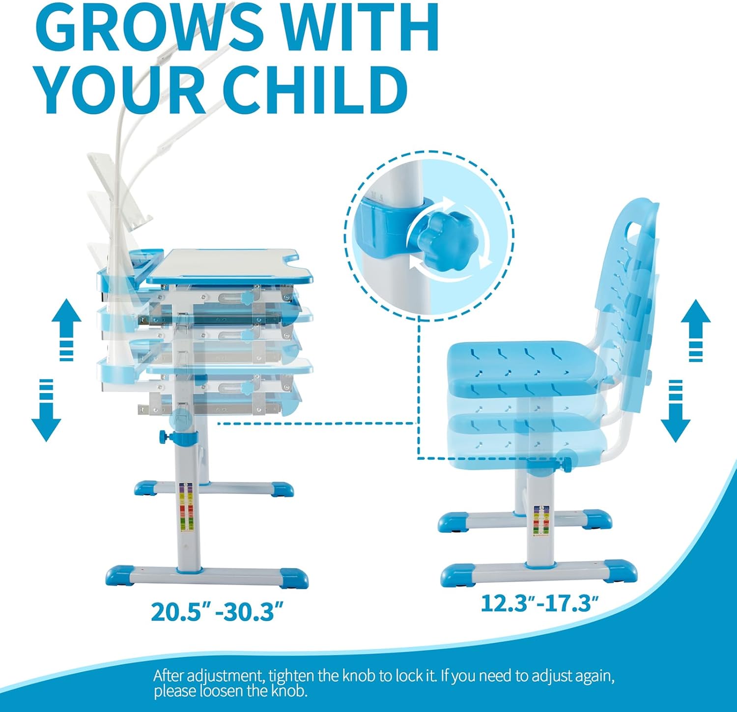 - ăDesigned for Growing MindsăOur study tables are adjustable and ergonomic,you can easily adjust height of table and chair according to the height of the child, accompanied with children growth for long-term use. Kid study chair is perfact for children at age 7-12 Years.