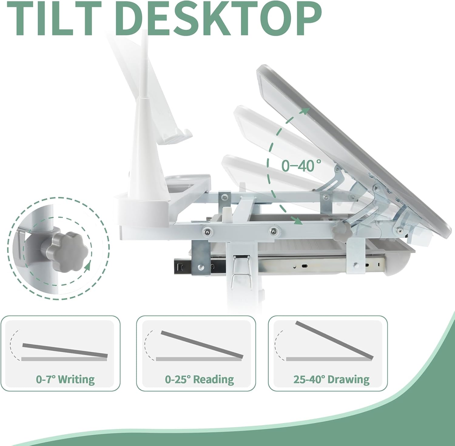 - ăErgonomic Comfort Tiltable DesktopăThe tiltable desktop allows your child to customize the angle(0~40°) of their study surface, promoting a healthy posture and reducing strain on their neck and back. It's a fantastic feature that ensures optimal comfort during long study sessions. Besides, this desk is equipped with anti-pinch stoppers to prevent hands from being pinched when kids rotate the desk.