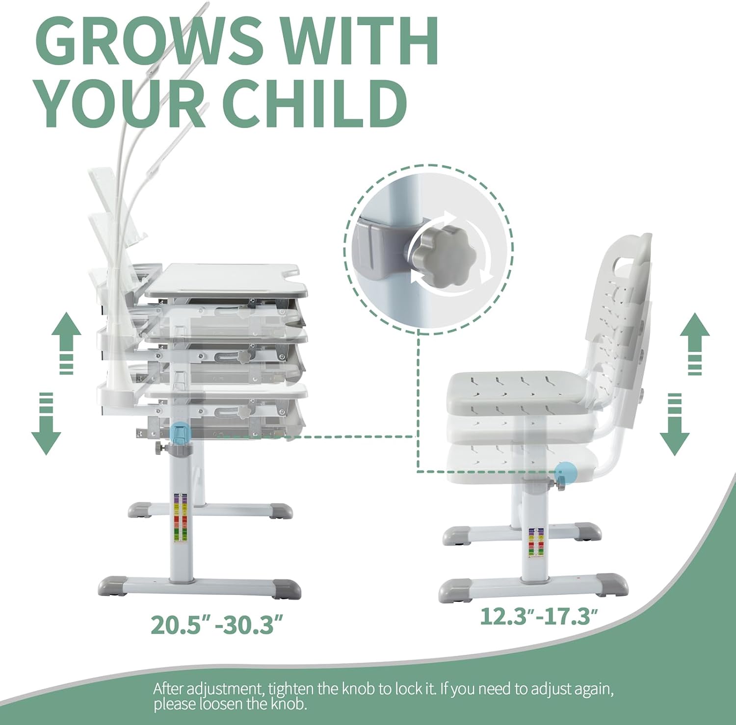 - ăDesigned for Growing MindsăOur study tables are adjustable and ergonomic,you can easily adjust height of table and chair according to the height of the child, accompanied with children growth for long-term use. Kid study chair is perfact for children at age 7-12 Years.